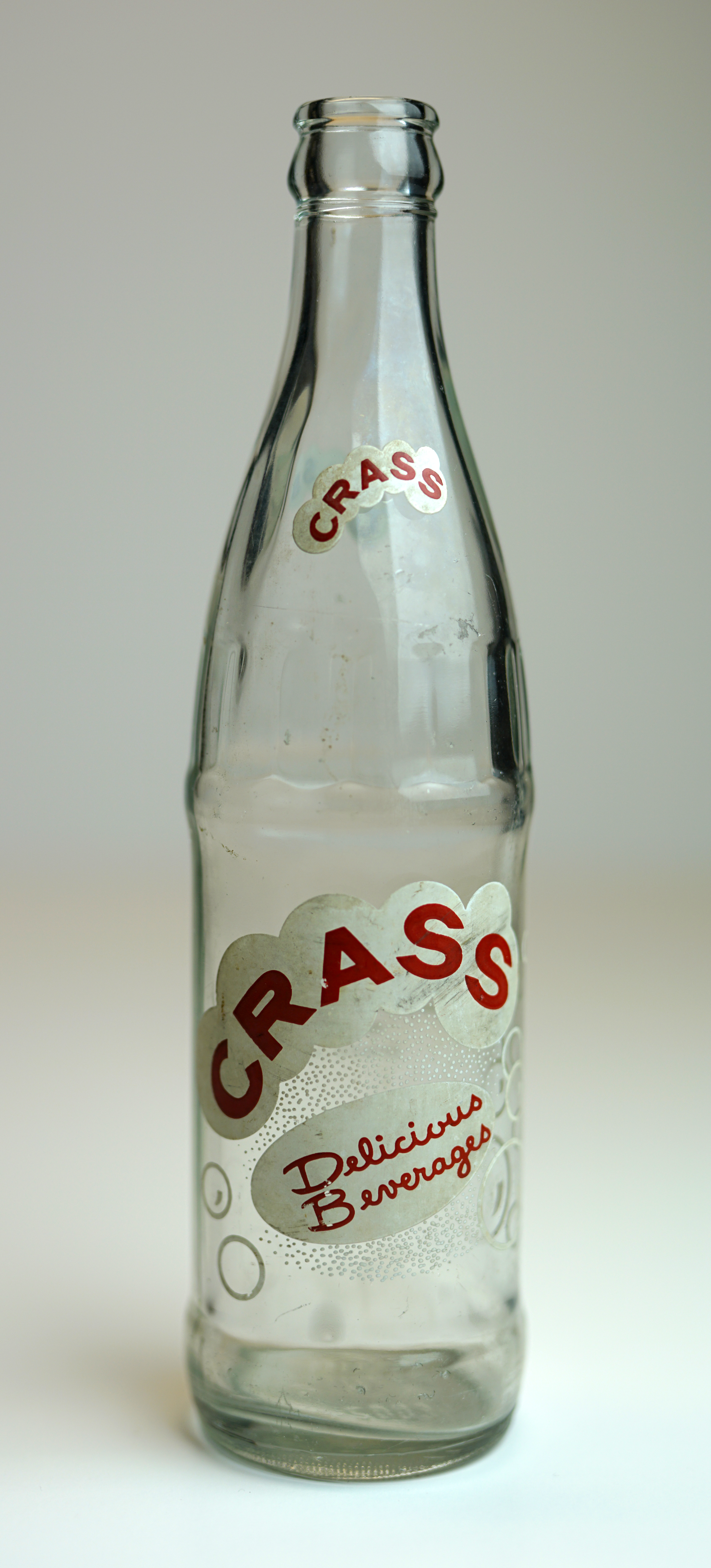 - Clear glass bottle red and white painted labeling with "Bubble" Design: "Crass Delicious Beverages."