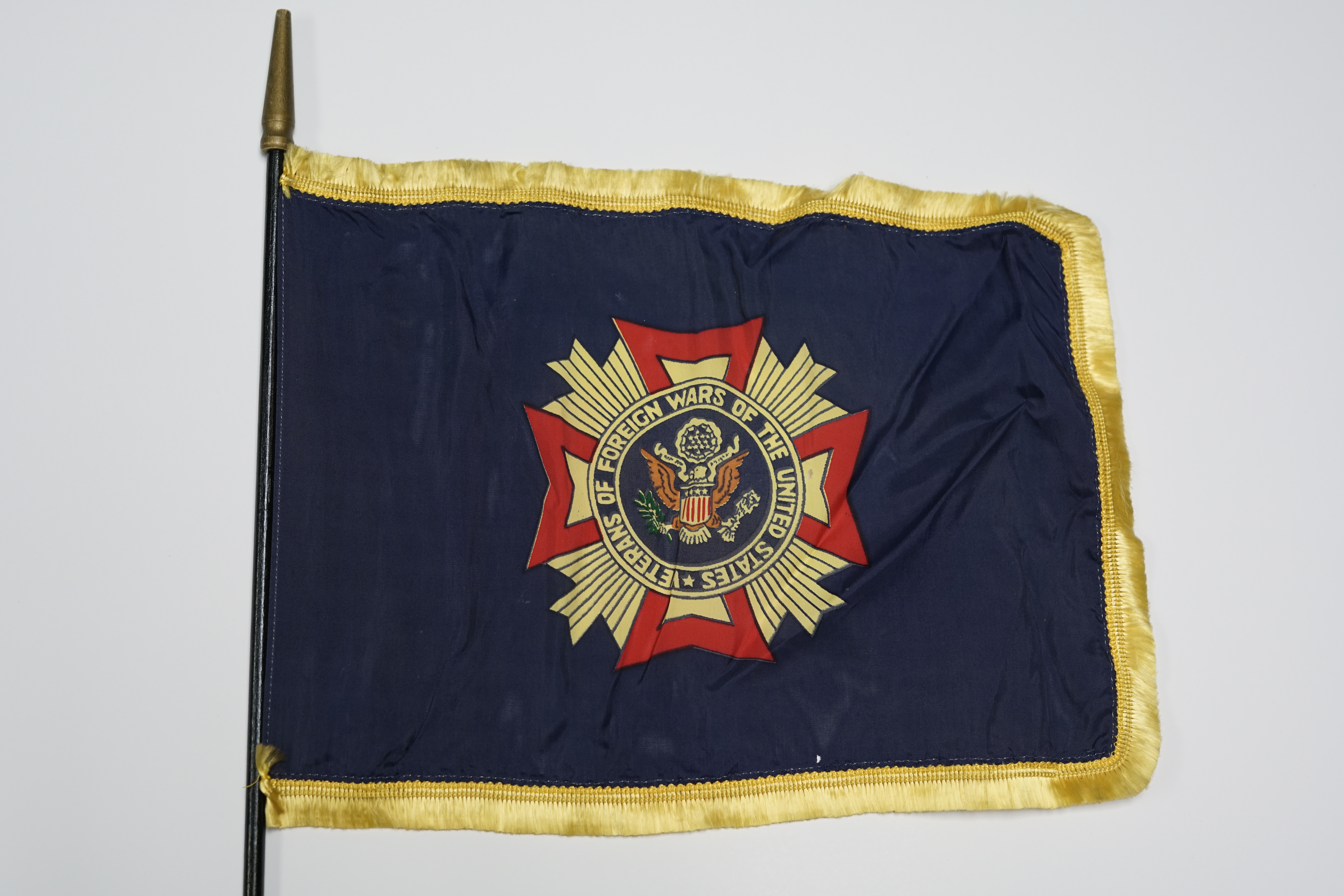 - Colorized photo image of a small flag for the Veterans of Foreign Wars of the United States. Flag is navy blue with the V. F. W. logo in the center. Outer edge is done in golden fringe.