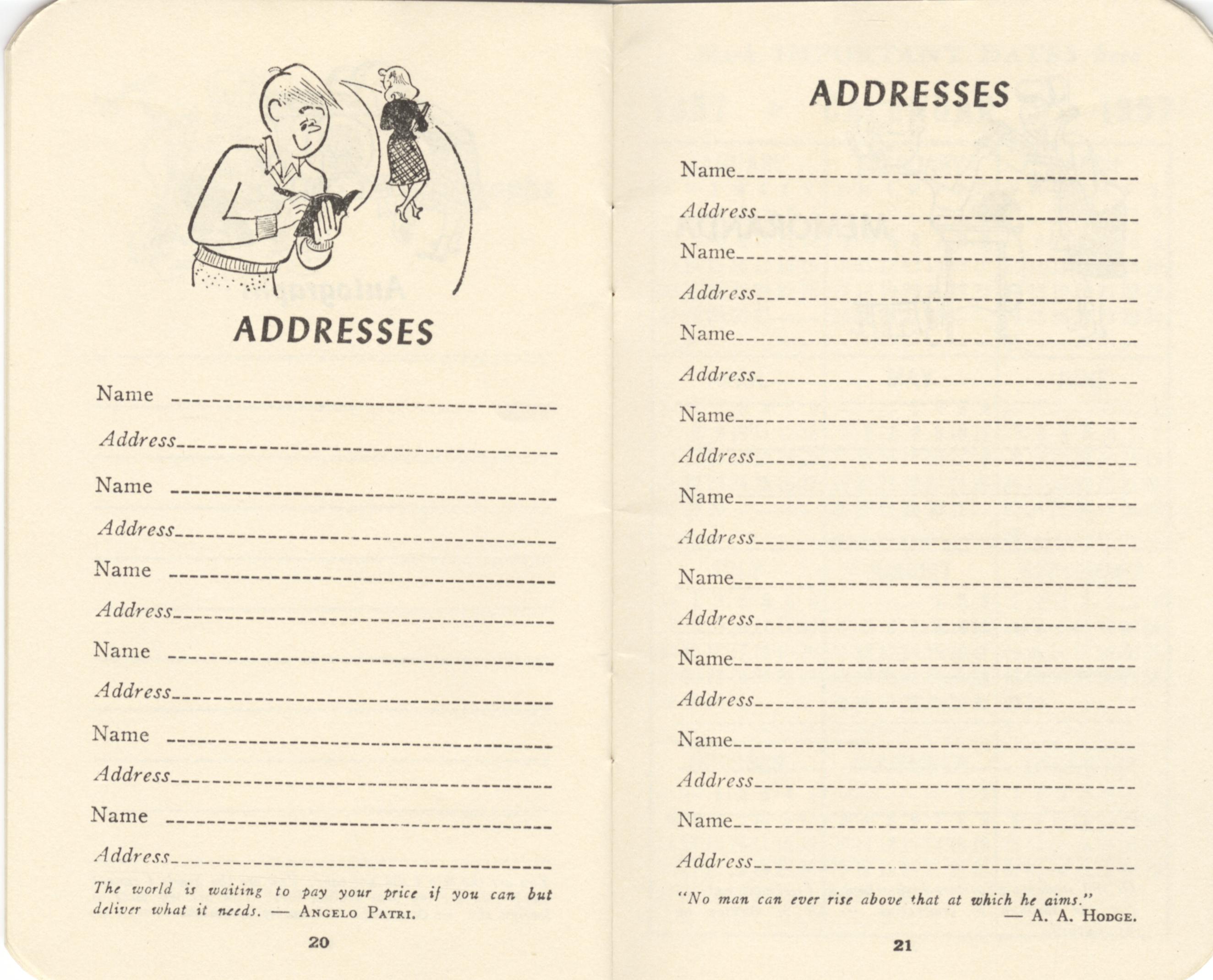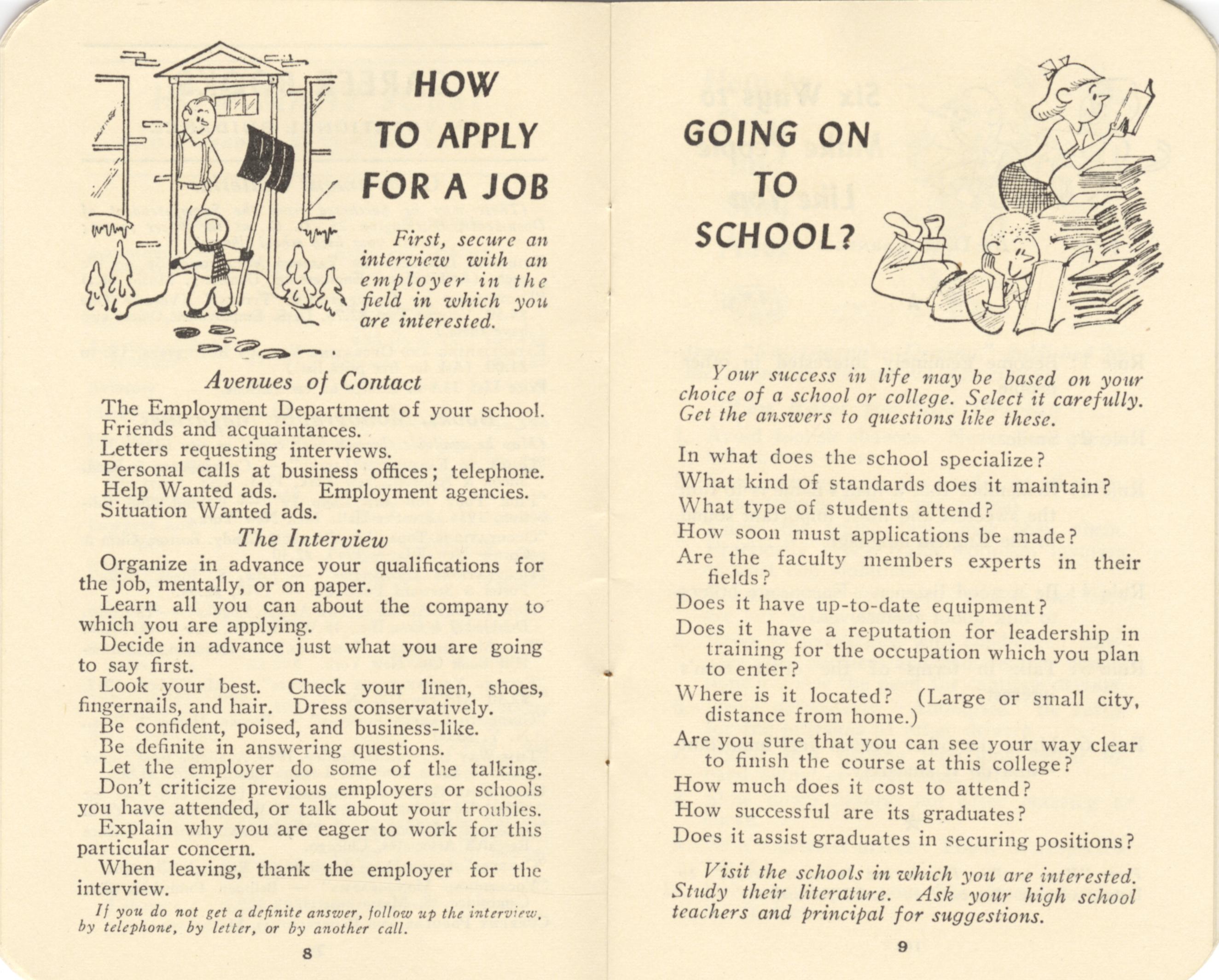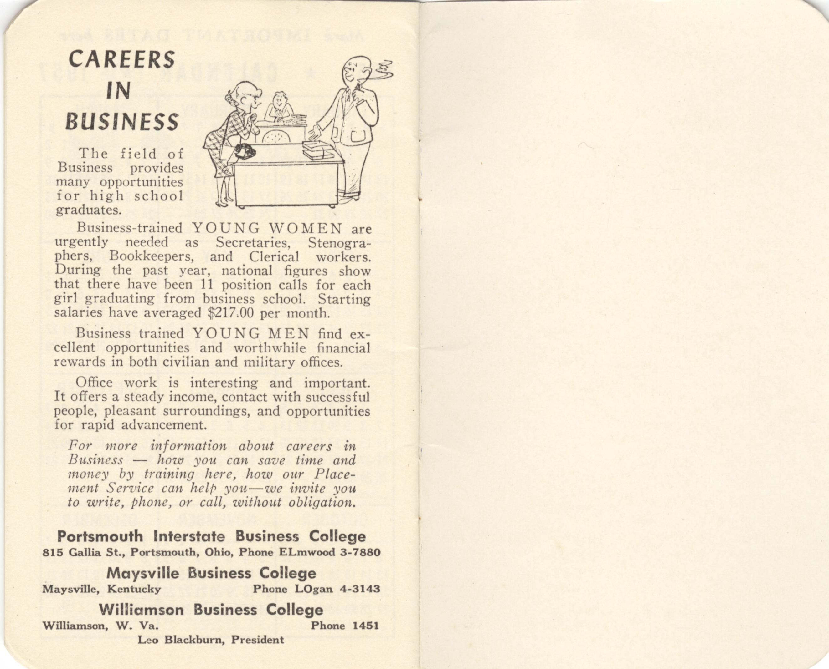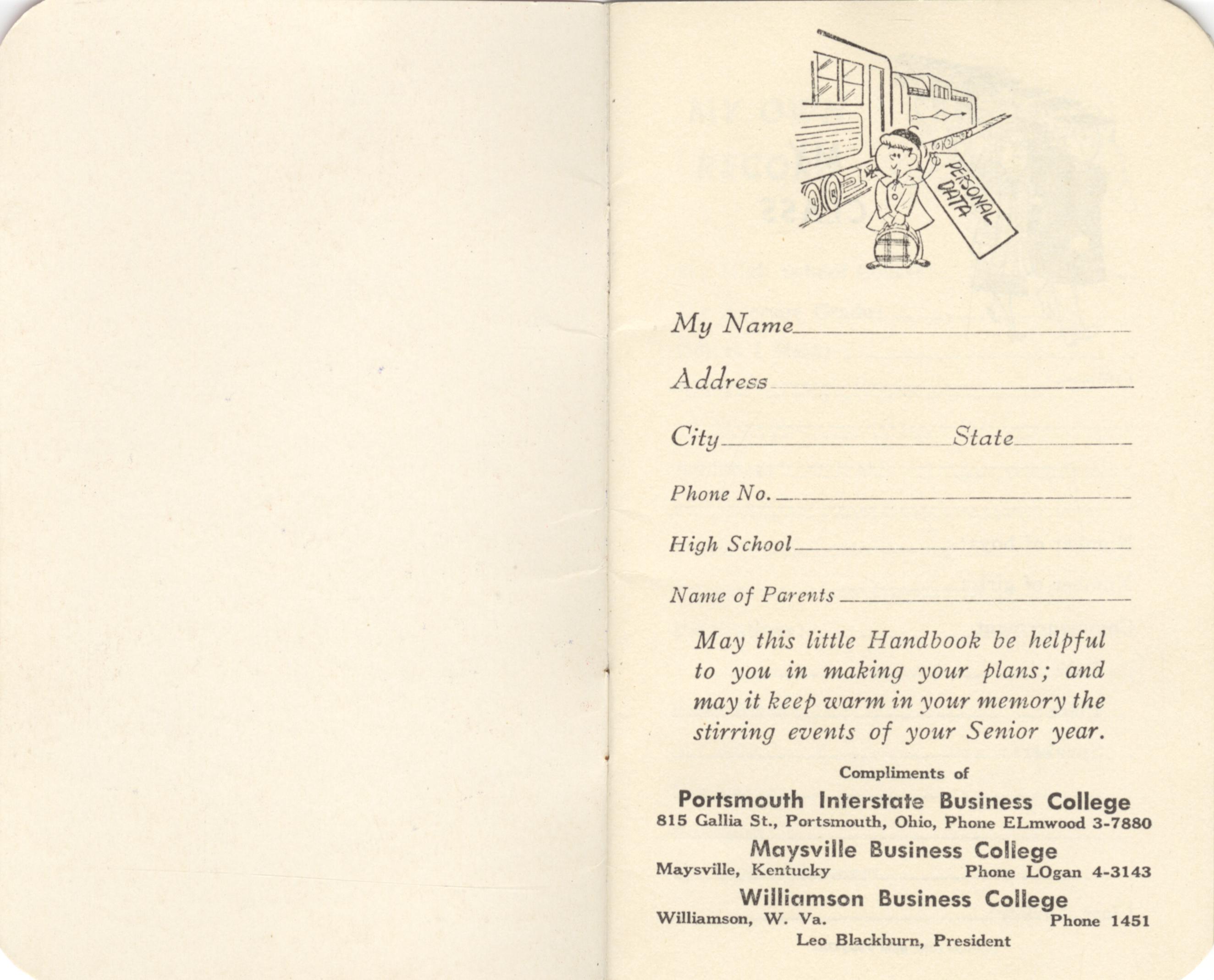- Red booklet with blue characters and white print. A 24-page booklet provided to high school seniors in 1957 by Portsmouth Interstate Business College. Booklet contains advice for future, record keeping, address book, etc. Nothing logged.