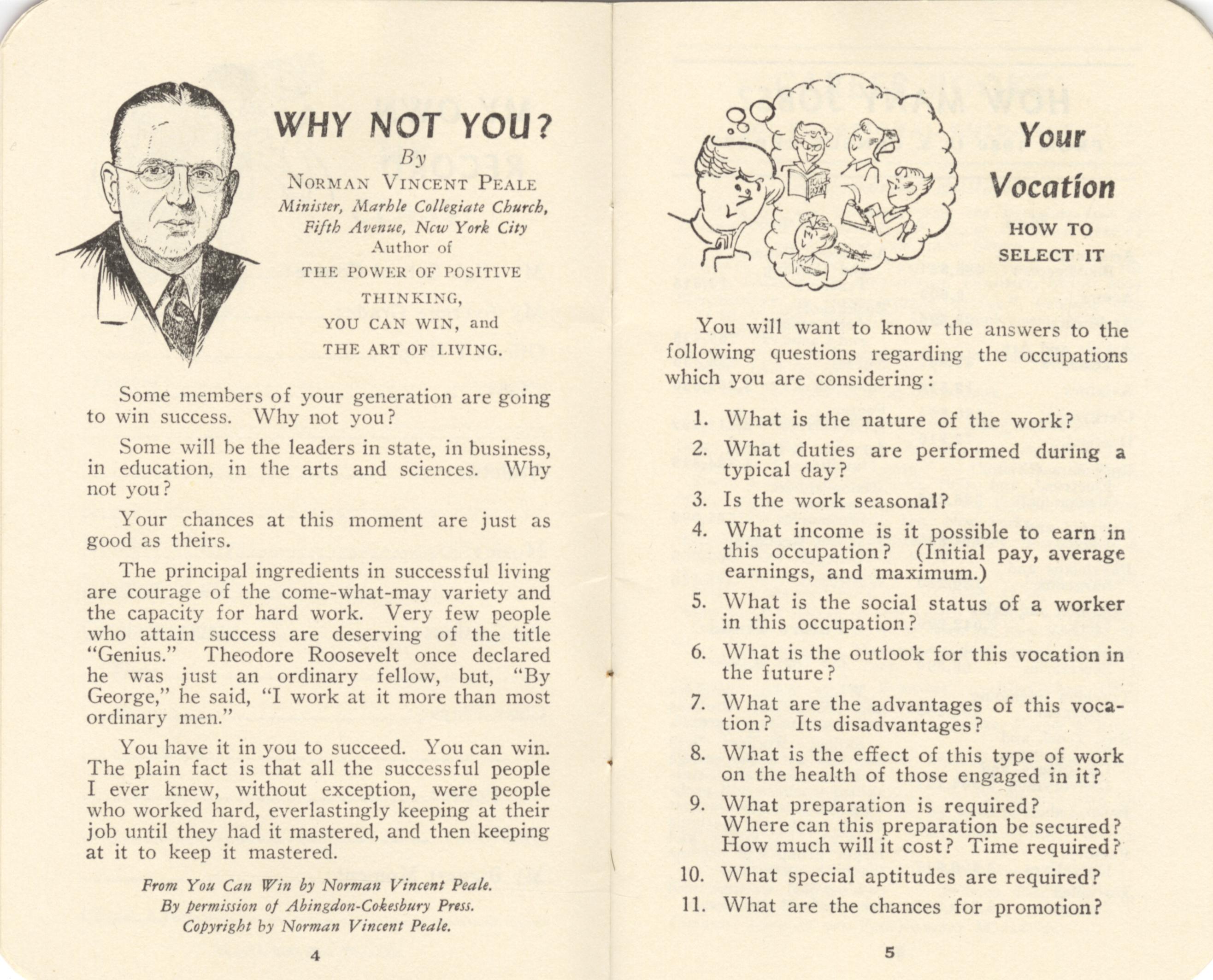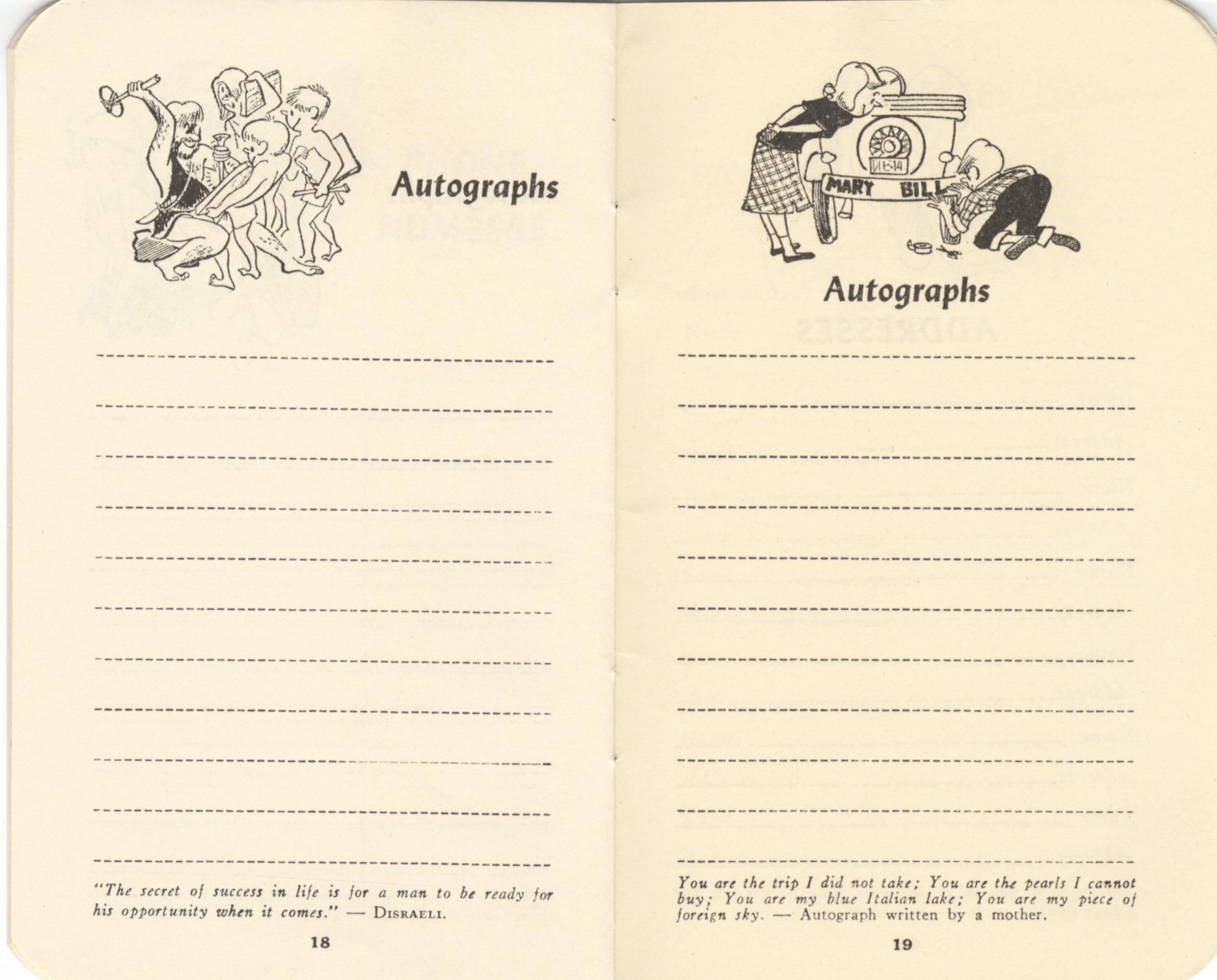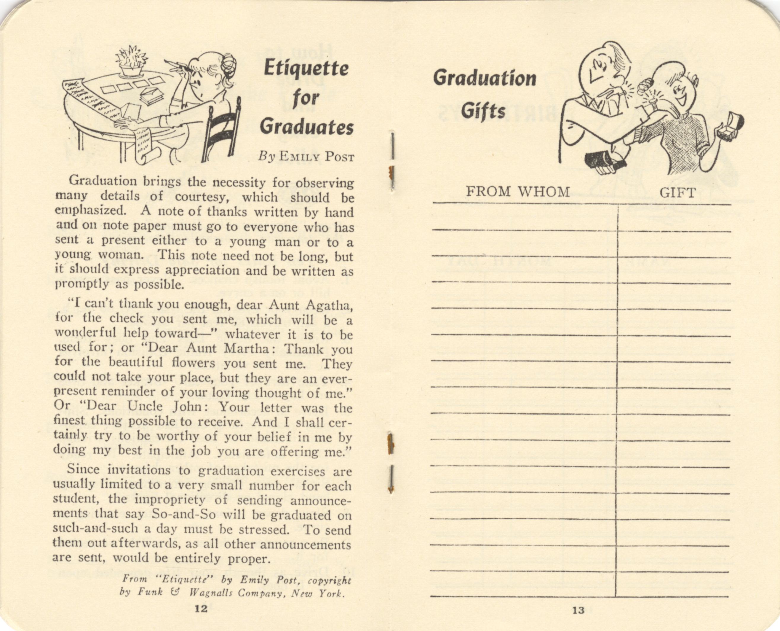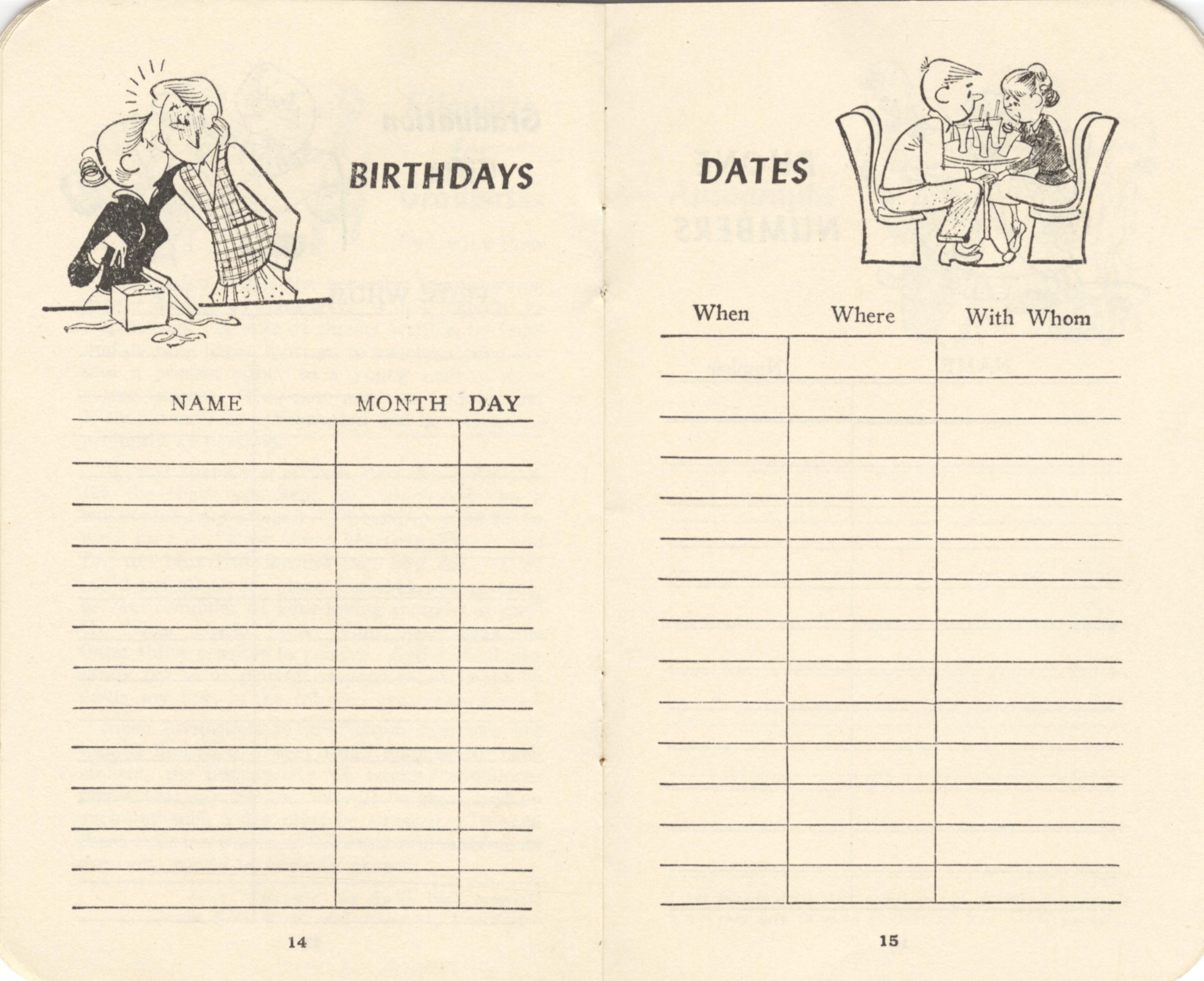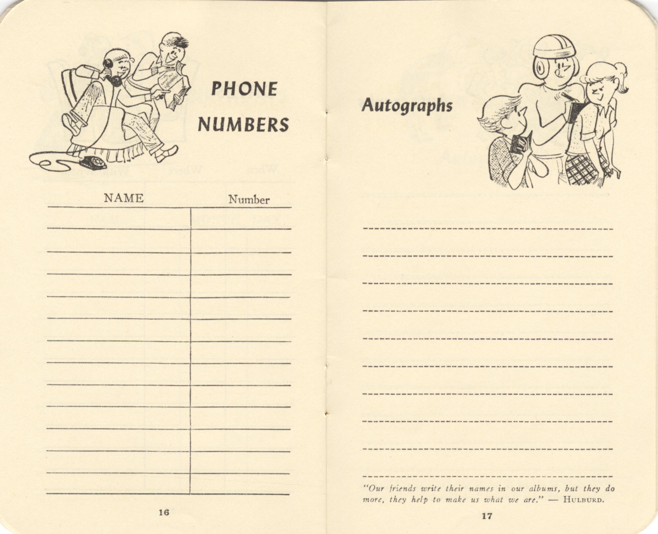 - Red booklet with blue characters and white print. A 24-page booklet provided to high school seniors in 1957 by Portsmouth Interstate Business College. Booklet contains advice for future, record keeping, address book, etc. Nothing logged.