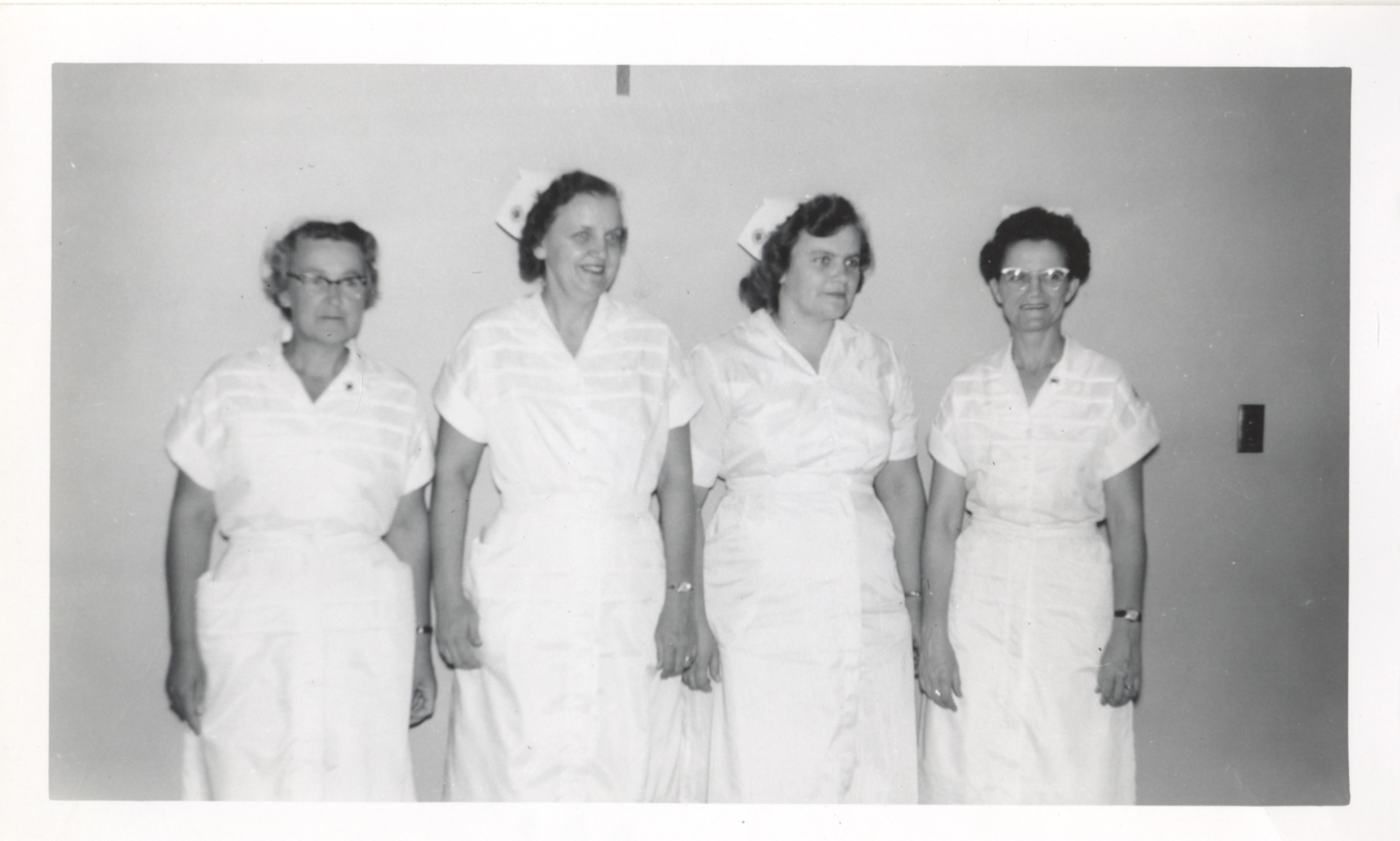 - Black and white photo image of a group of 4 nurses, taken in 1957.