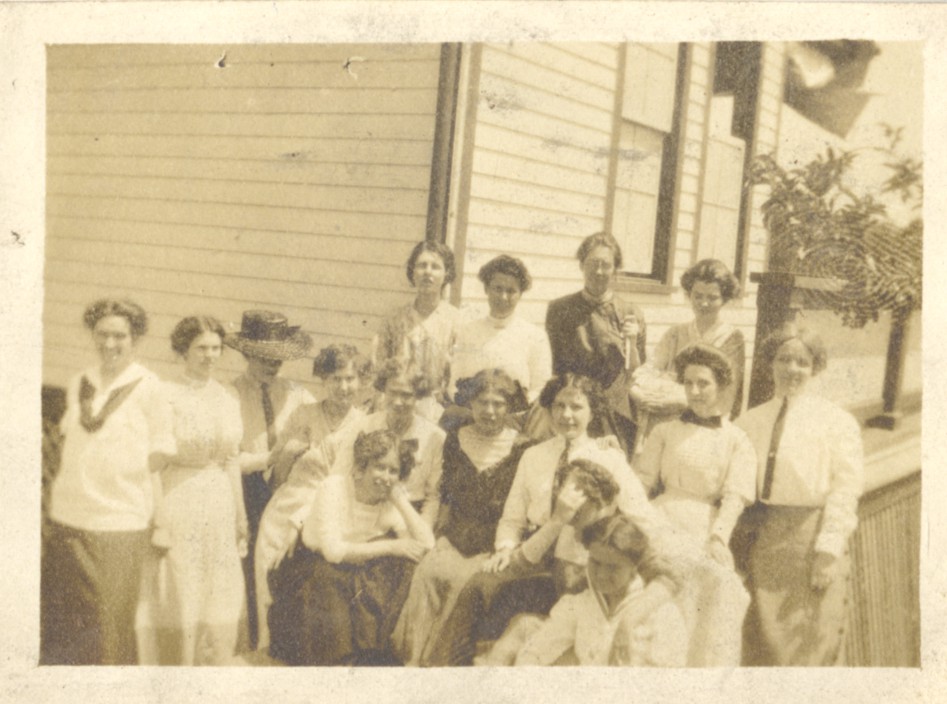 - Sepia tone photo of a group of women, identified only by last name, "looking overboard." Pictured: Gleason, Vaugh, Walshire, Lynch, Rutherford, Yates, Sting, Coleman, Repass, White, Lavender.
