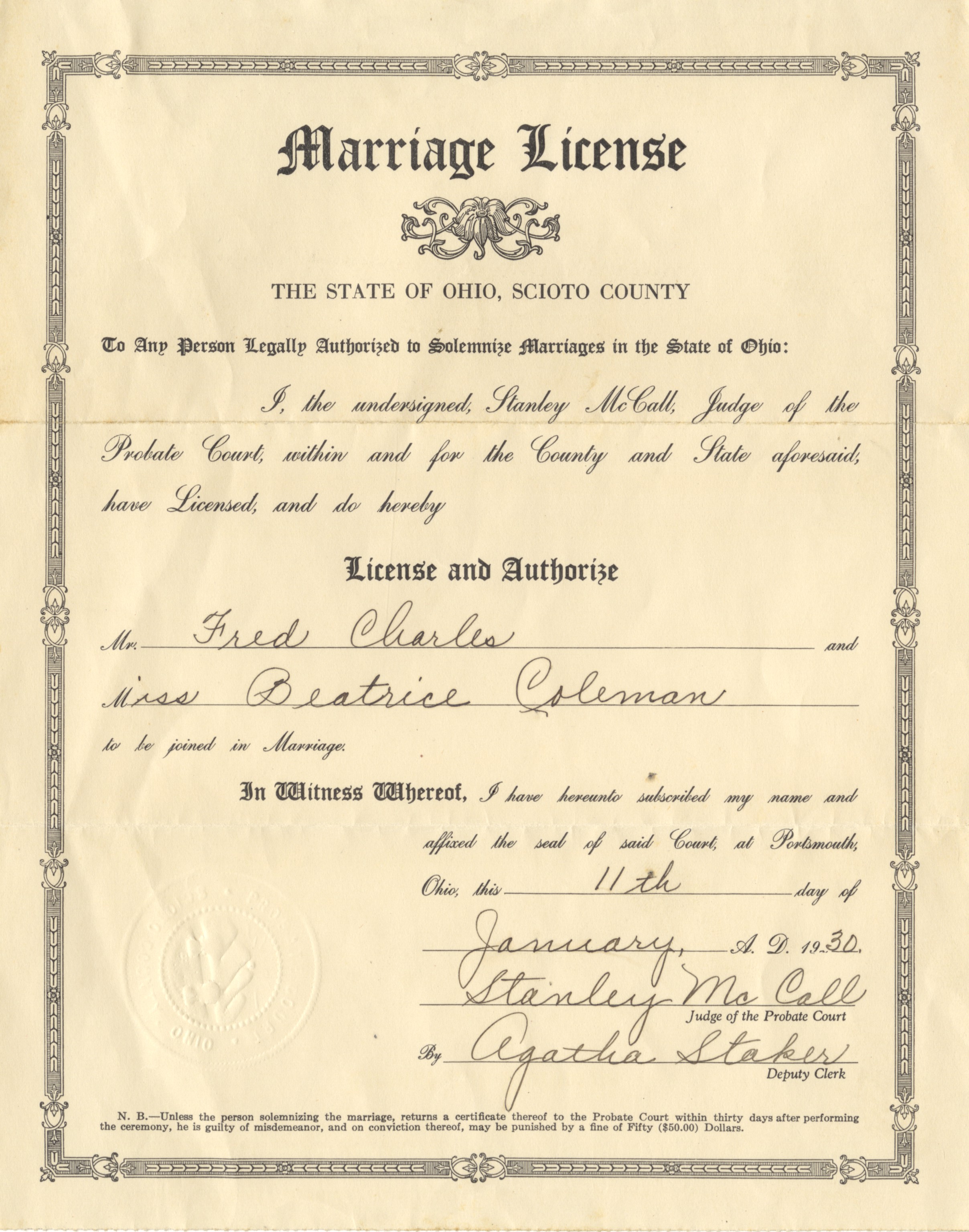 - Aged, off-white paper form with black calligraphy and black ink signatures. This license is for Fred Charles and Beatrice Coleman in Scioto County Seal.