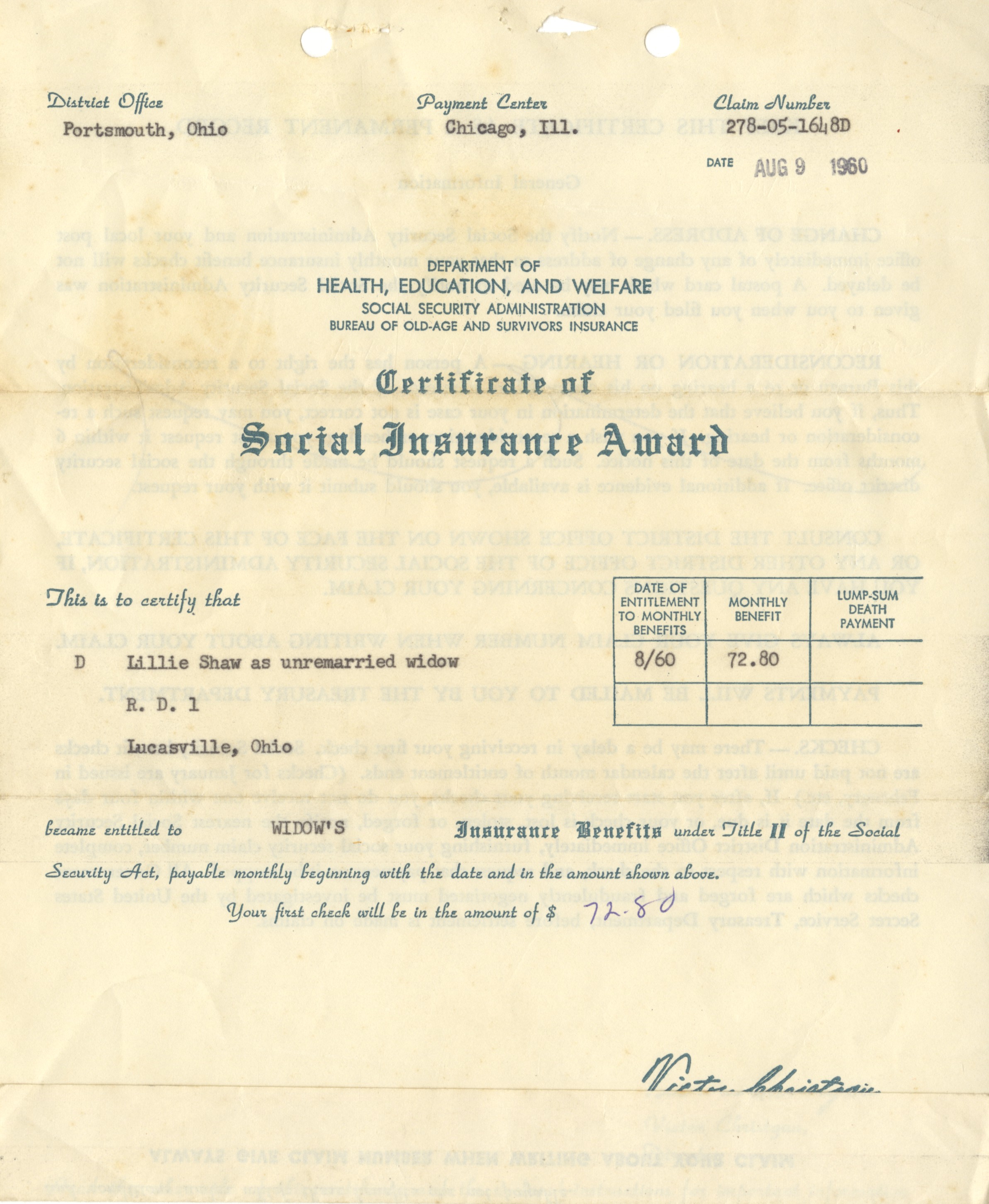 Unknown , “Certificate of Social Insurance,” Scioto County Public Library Local History Digital Collection, accessed December 17, 2025, https://sciotolibrary.org/history/items/show/28205.