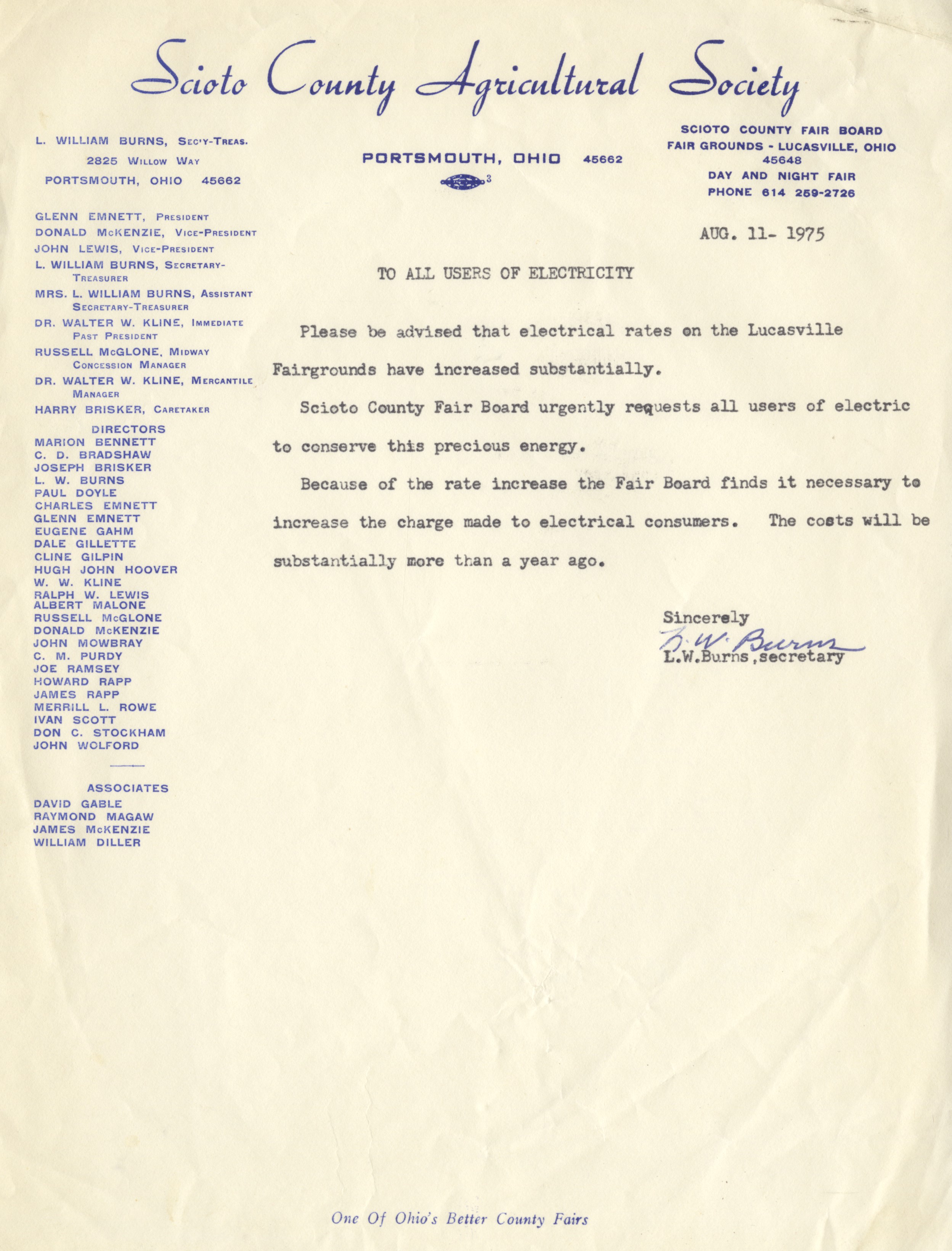 - scan of typed letter by L. W. Burns to all electricity users discussing the increased electricity rate. Letter typed on Scioto County Agricultural Society letterhead in blue. L. W. Burns signature is also in blue ink.