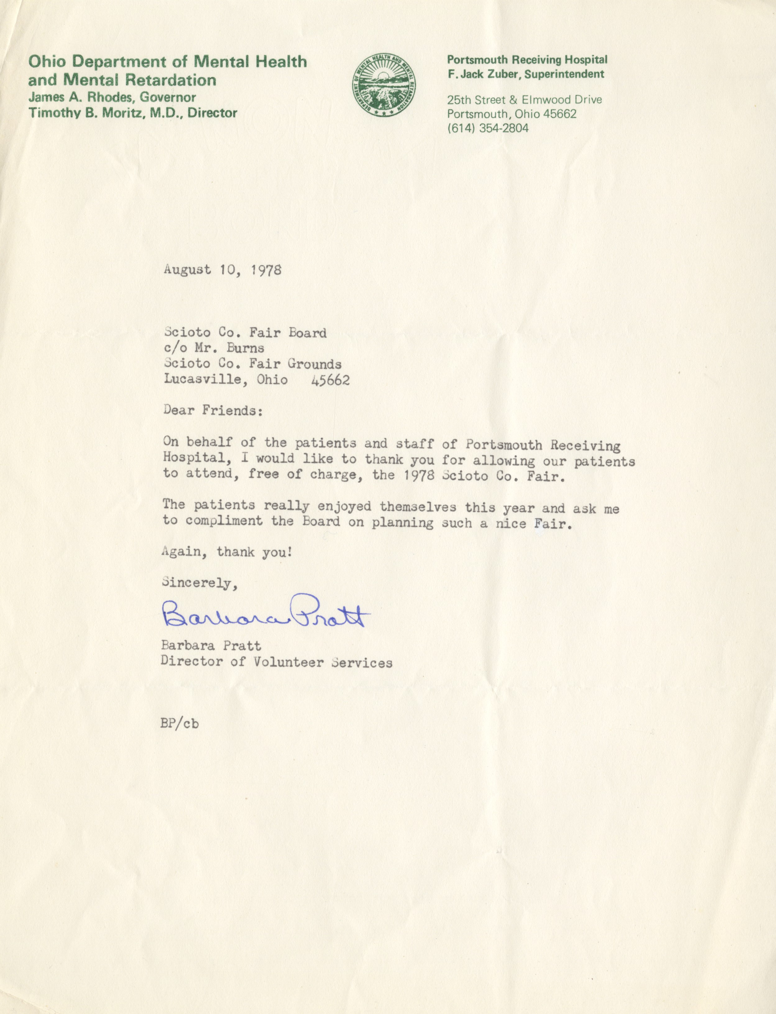 - scan of typed letter from the Ohio Department of Mental Health and Mental Retardation to the Scioto County Fair Board. Letter contents thank the Fair Board for planning the fair from the patients who attended.