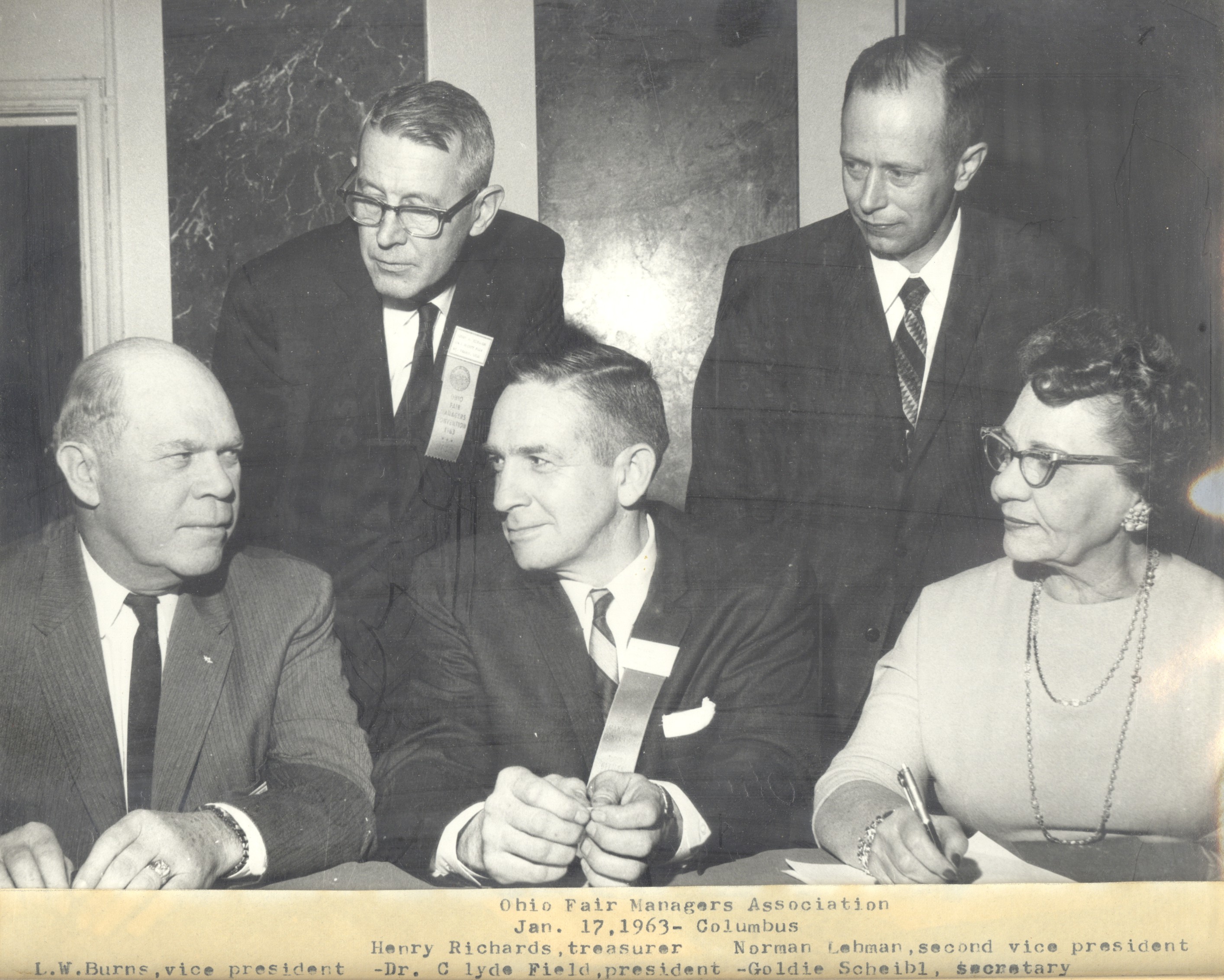 - scan of black and white photo of the Ohio Fair Managers Association, dated January 17, 1963. Pictured: back row (L-R) Henry Richards, Treasurer; Norman Lehman, Second Vice President. Front row: (L-R) L. W. Burns, Vice President; Dr. Clyde Field, President; Goldie Scheibl, Secretary.