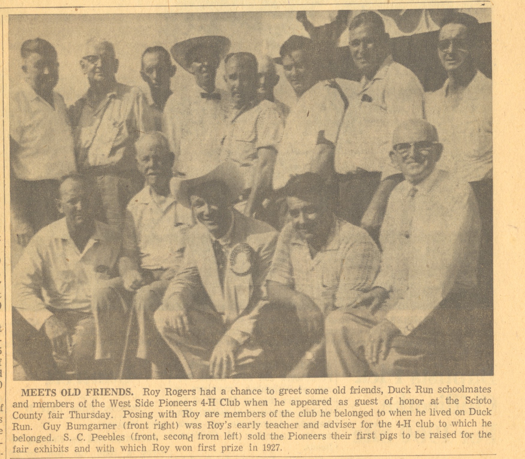 - scan of newspaper article about Roy Rogers at the Scioto County Fair in 1959. Posing with Roy are Duck Run schoolmates and members of the West Side Pioneers 4-H Club (Roy was a member). Also pictured is: front right, Guy Bumgarner (Roy's teacher/advisor) and S. C. Peebles, front, 2nd from left.