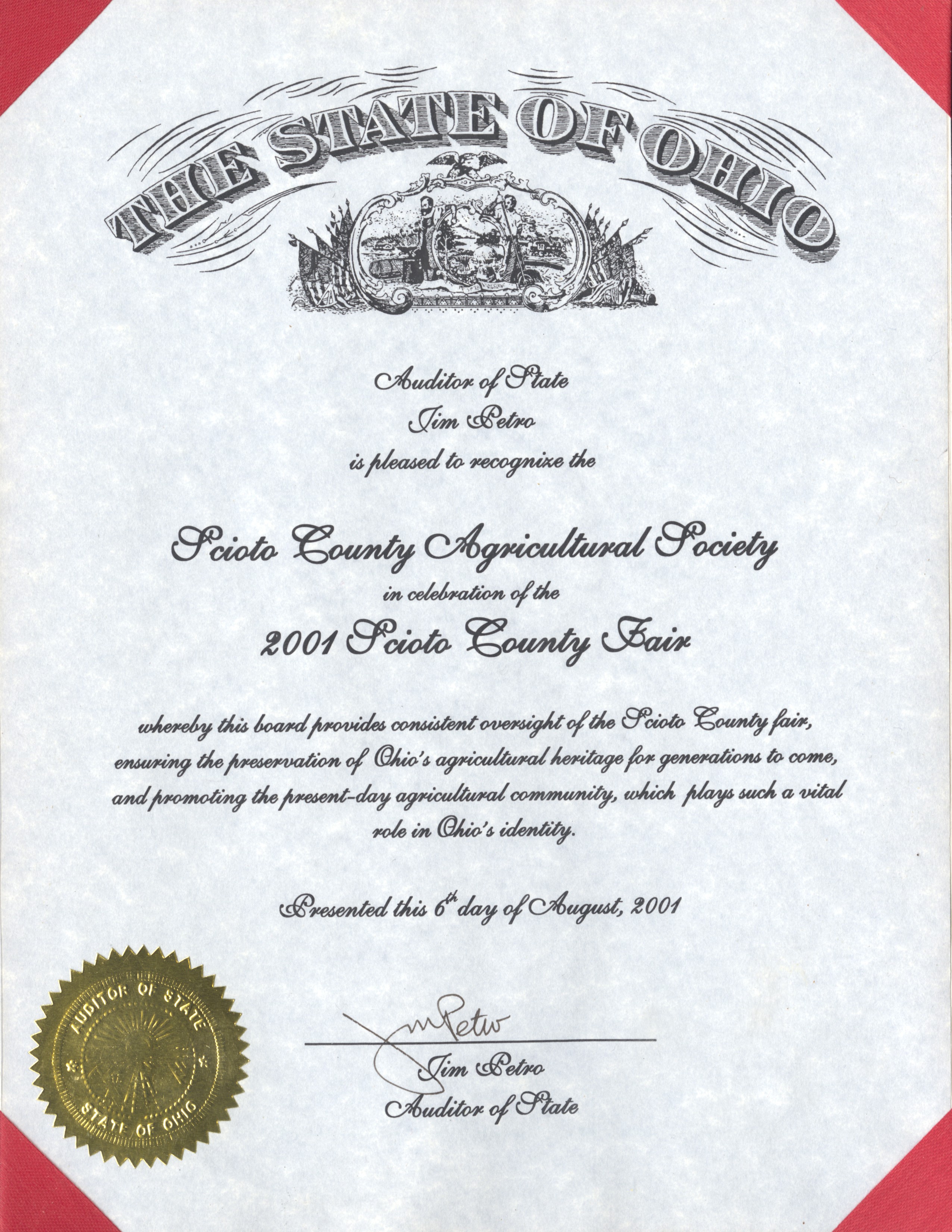 - scan of a certificate for the Scioto County Agricultural Society for the 2001 fair