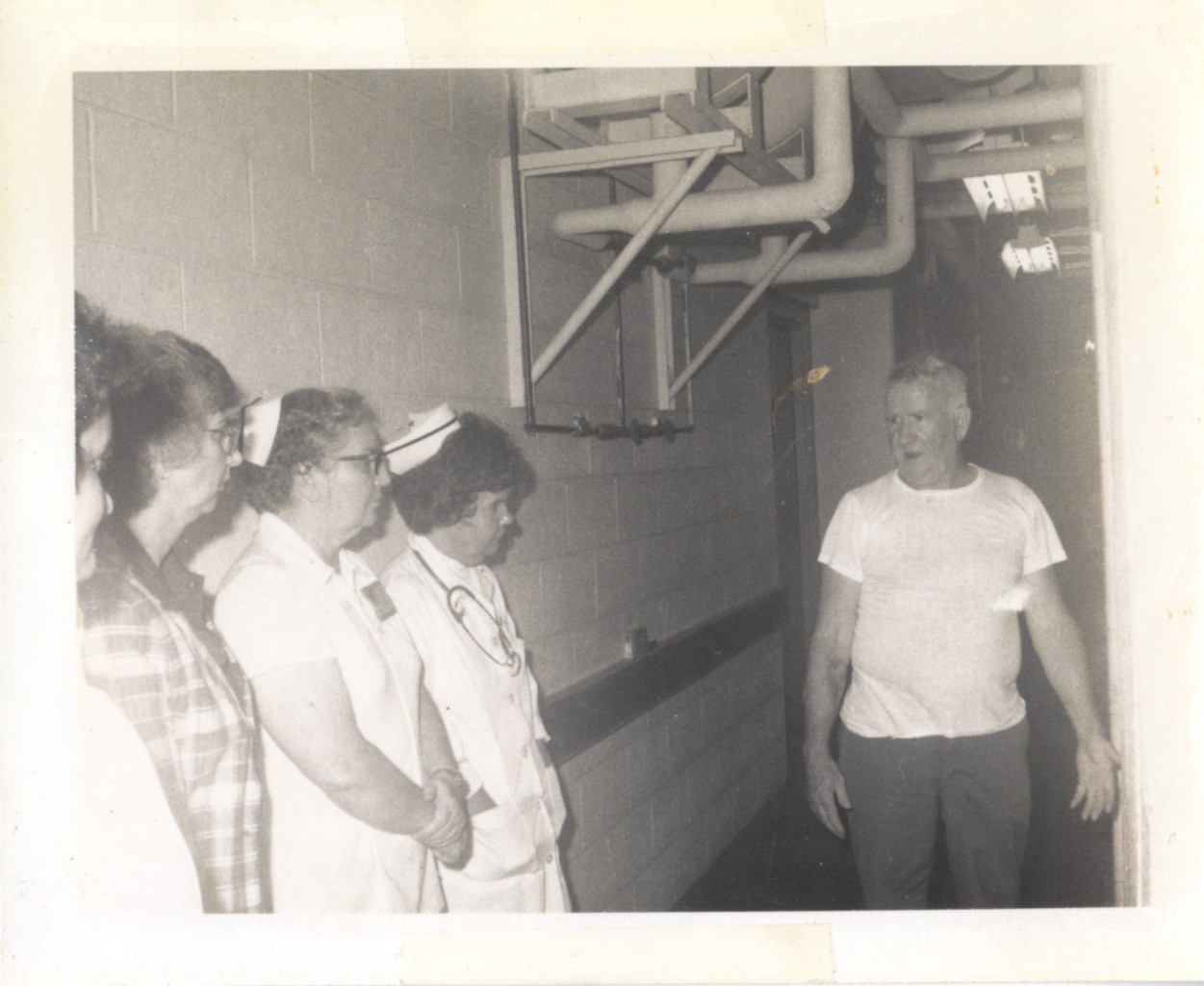 - Black and white photo image of John Pace Housekeeping manager, providing a tour to hospital employees