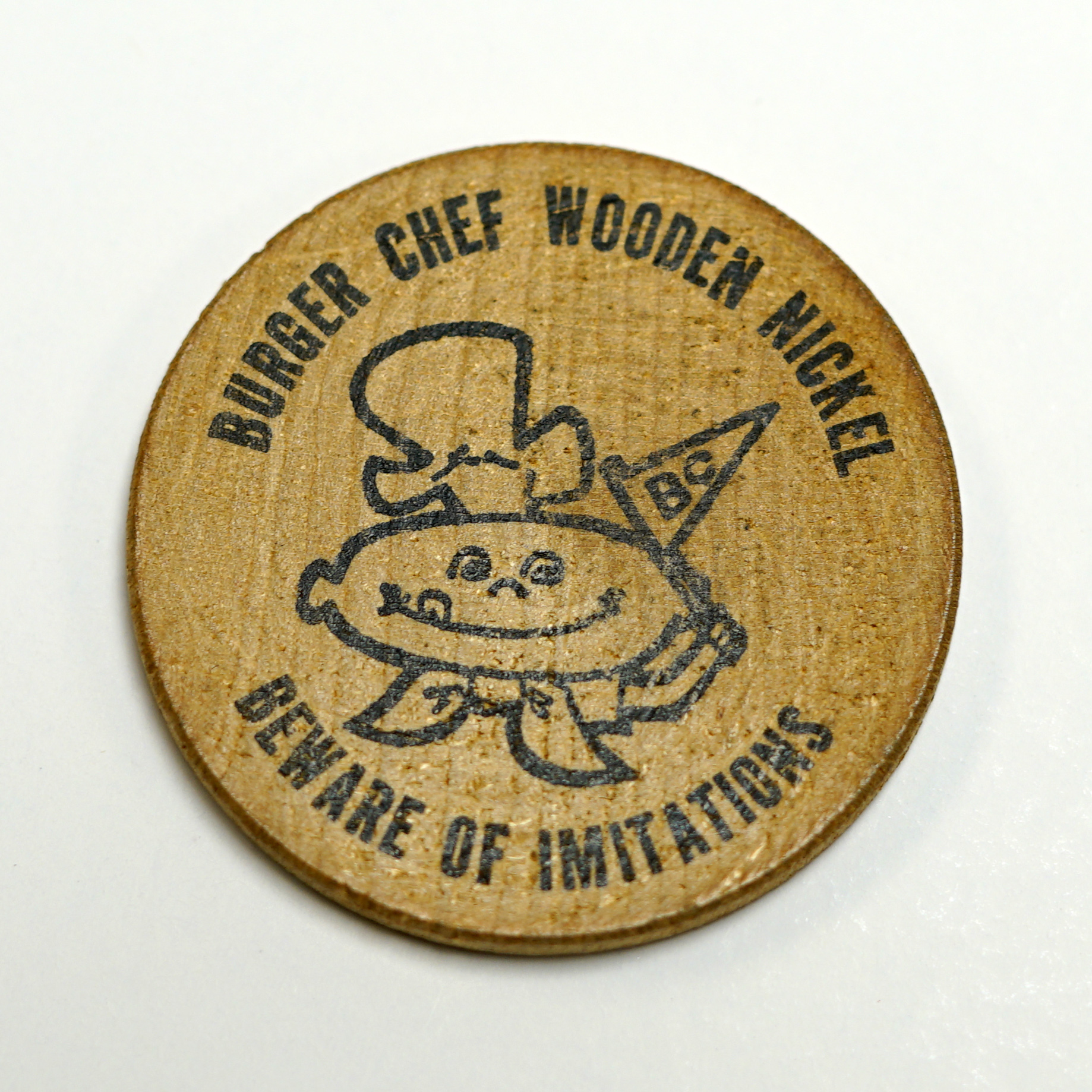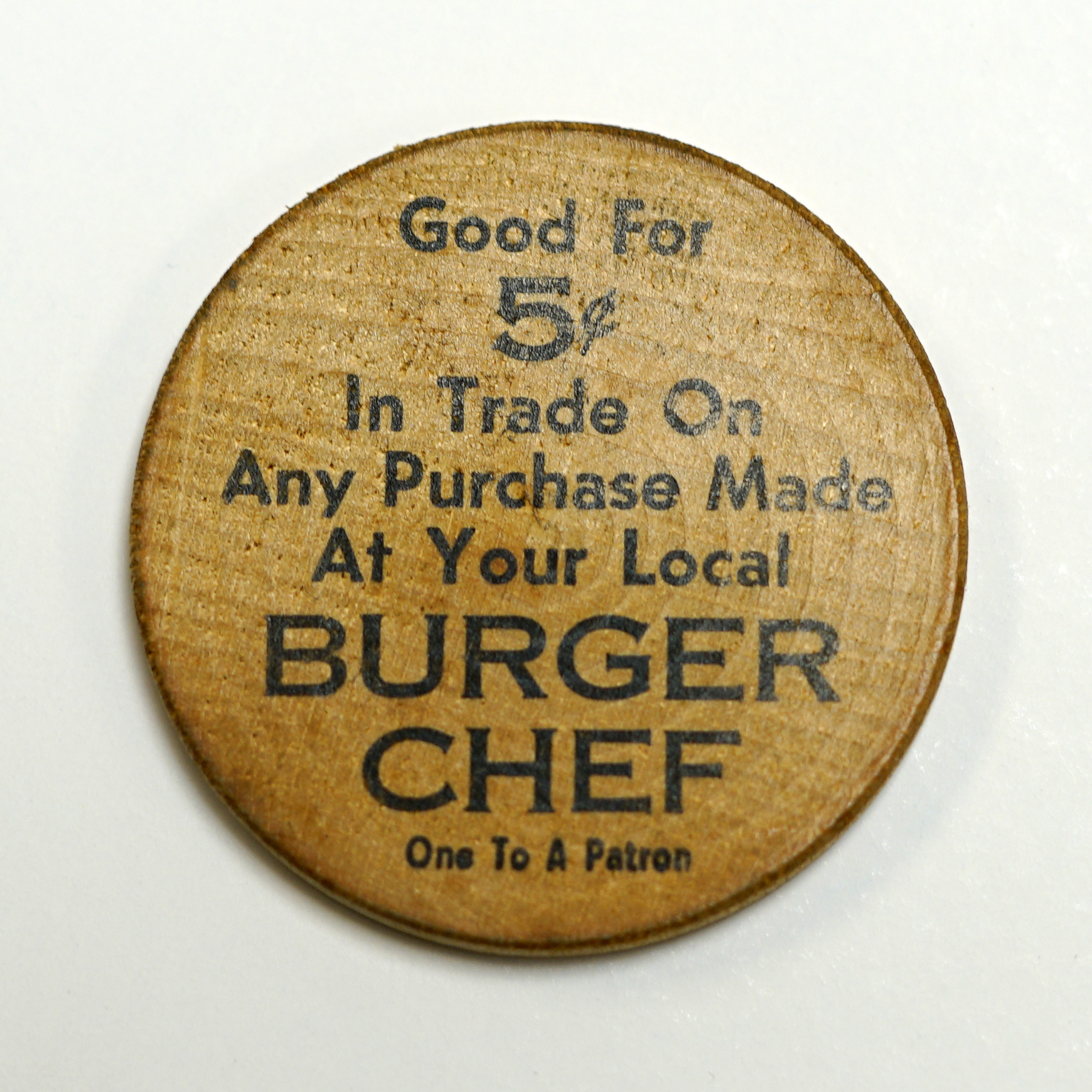 - Round, wooden token with black print advertising "Good for 5¢" Burger Chef. Located at 2734 Scioto Trail.