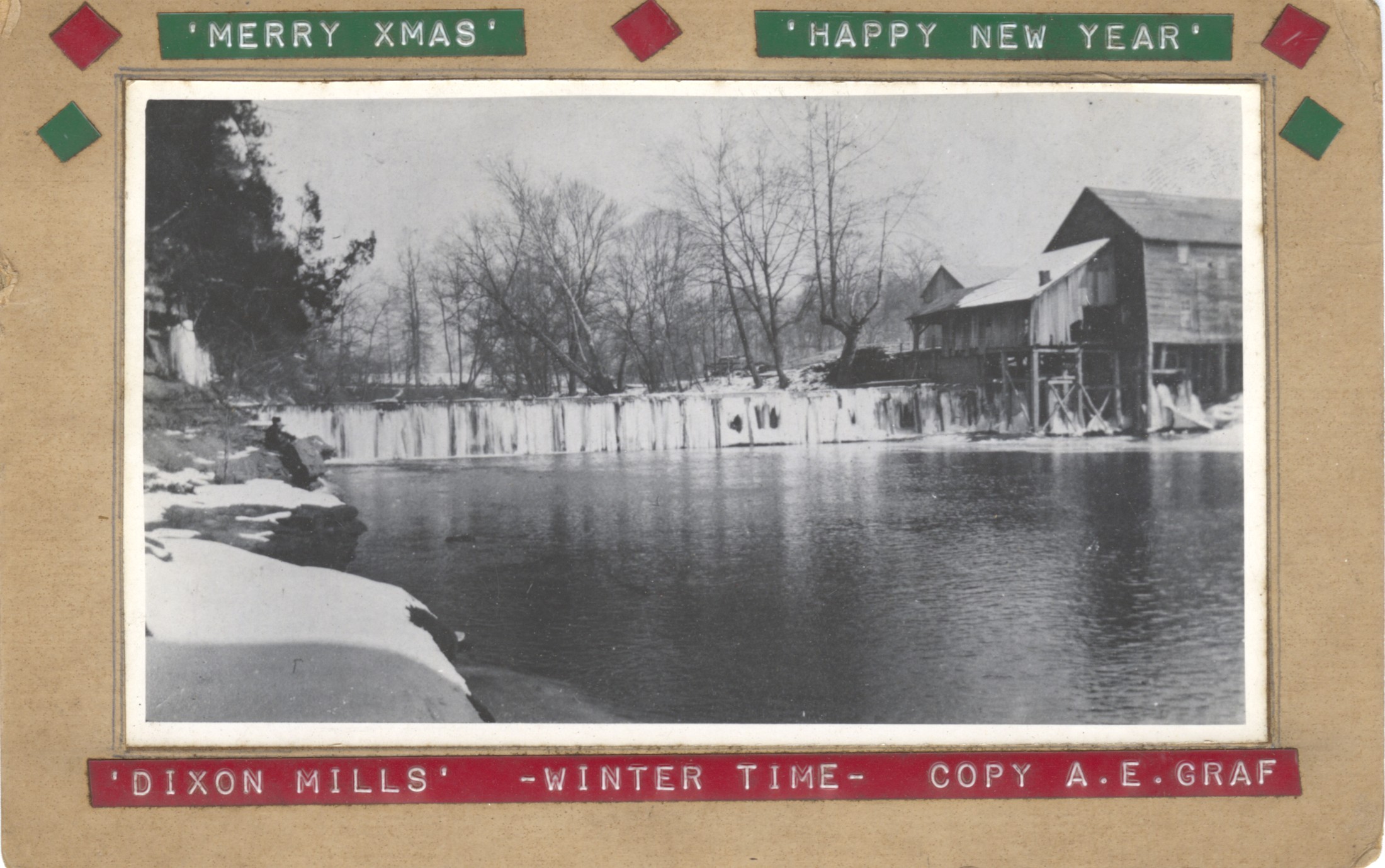 - Black and white photo image on cardboard, with red and green labels on front that read: "Merry XMas", "Happy New Year", and "Dixon Mills - Winter Time - Copy A.E. Graf".