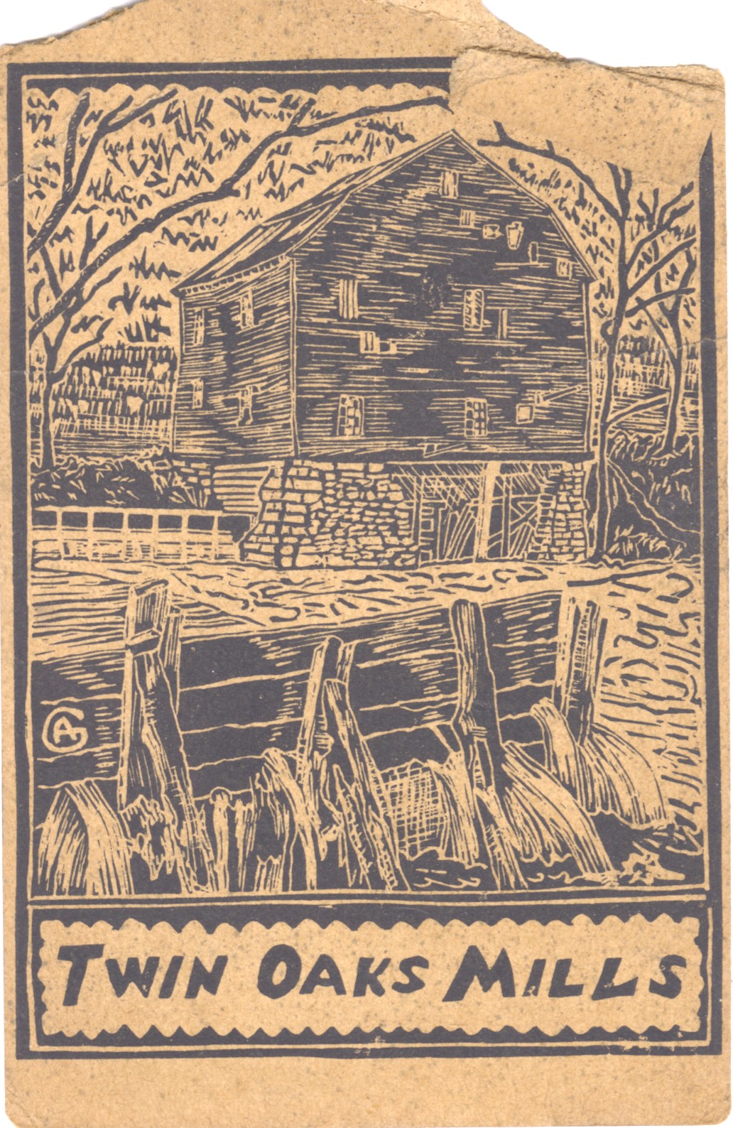 - An artist illustration of Twin Oaks Mills on cardboard-like material. Top is ripped and bent. Twin Oaks Mills is located on Pine Creek in Wheelersburg.