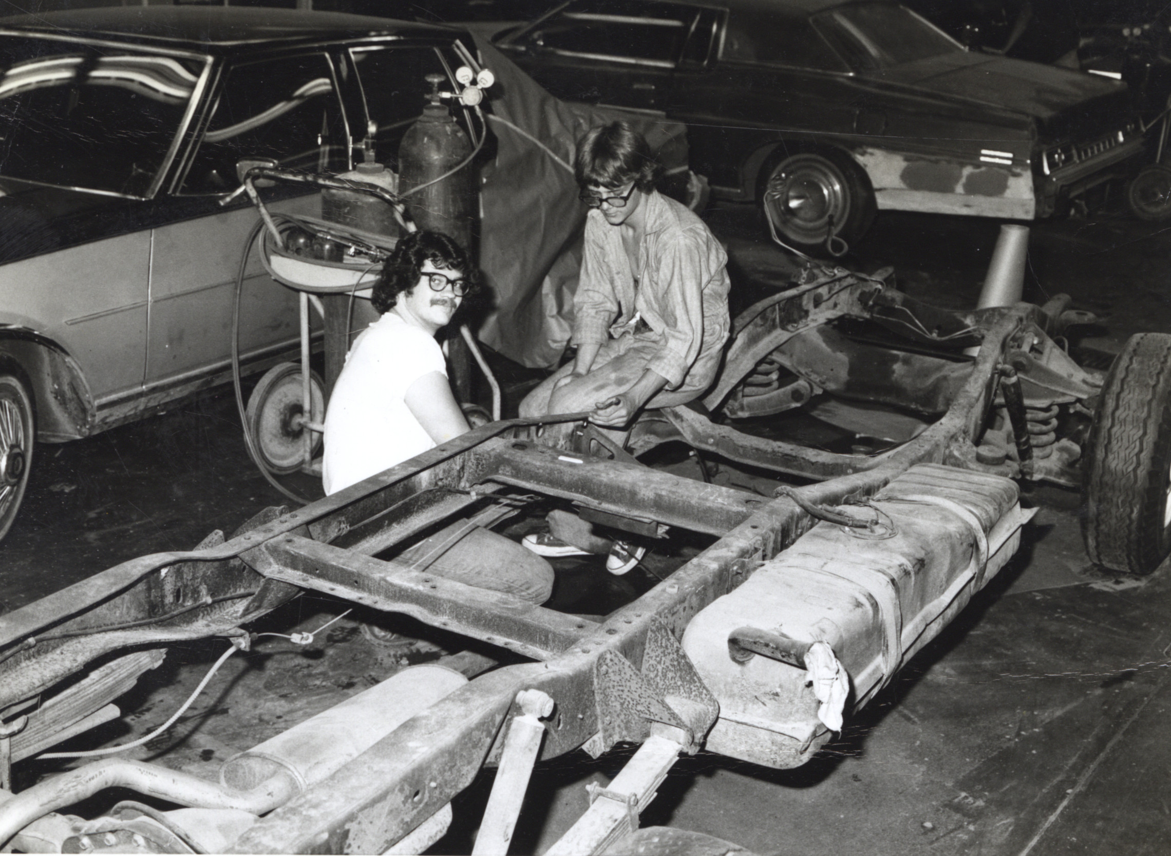 - Black and white photo of two unknown young men taking an Auto Body shop class at Scioto County Joint Vocational School.