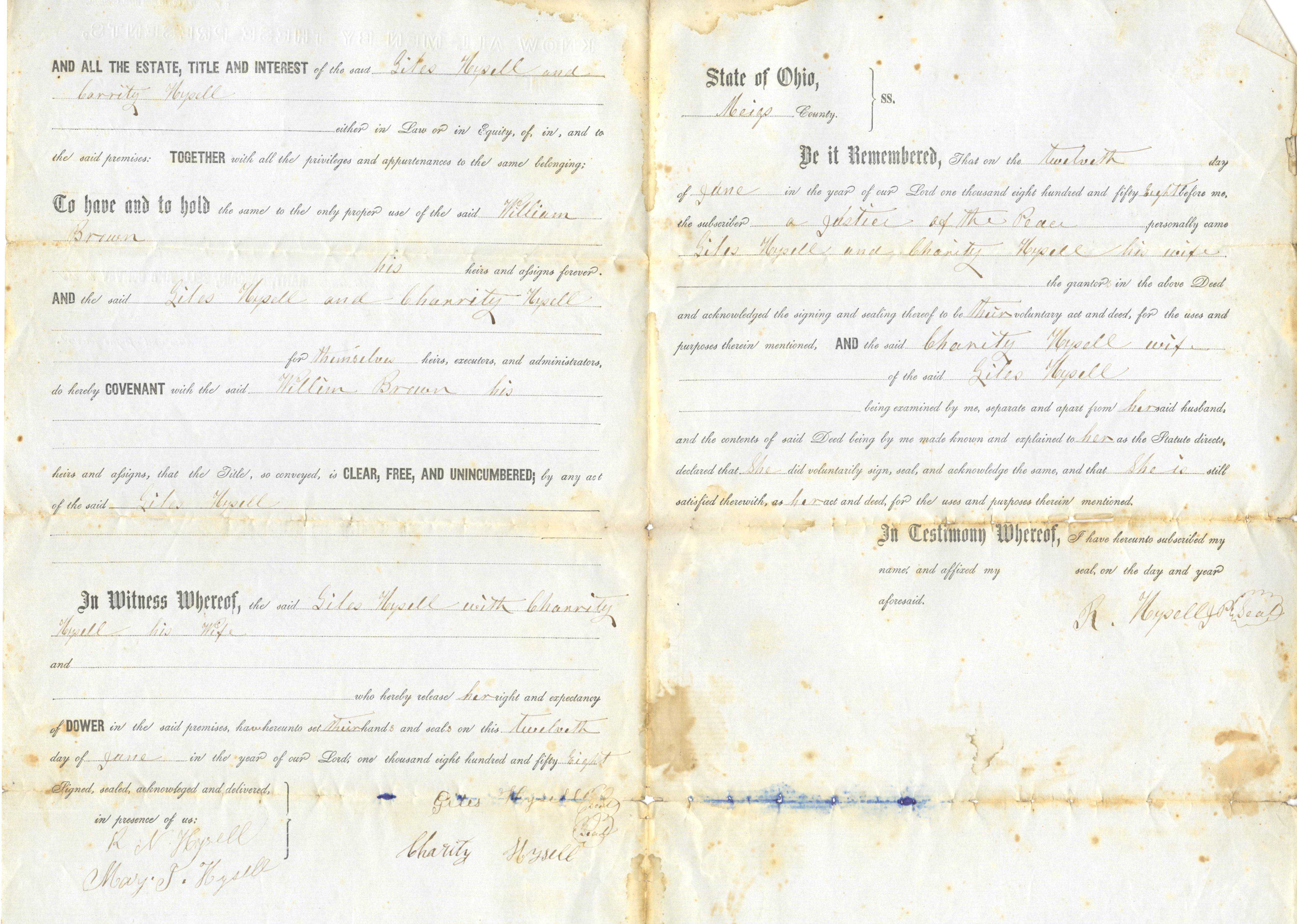 - Age, light blue paper with fixing, water and ink damage. Inked script indicating sale of land by Giles and Charity Hysell of Meigs County that of Scioto County to William Brown.