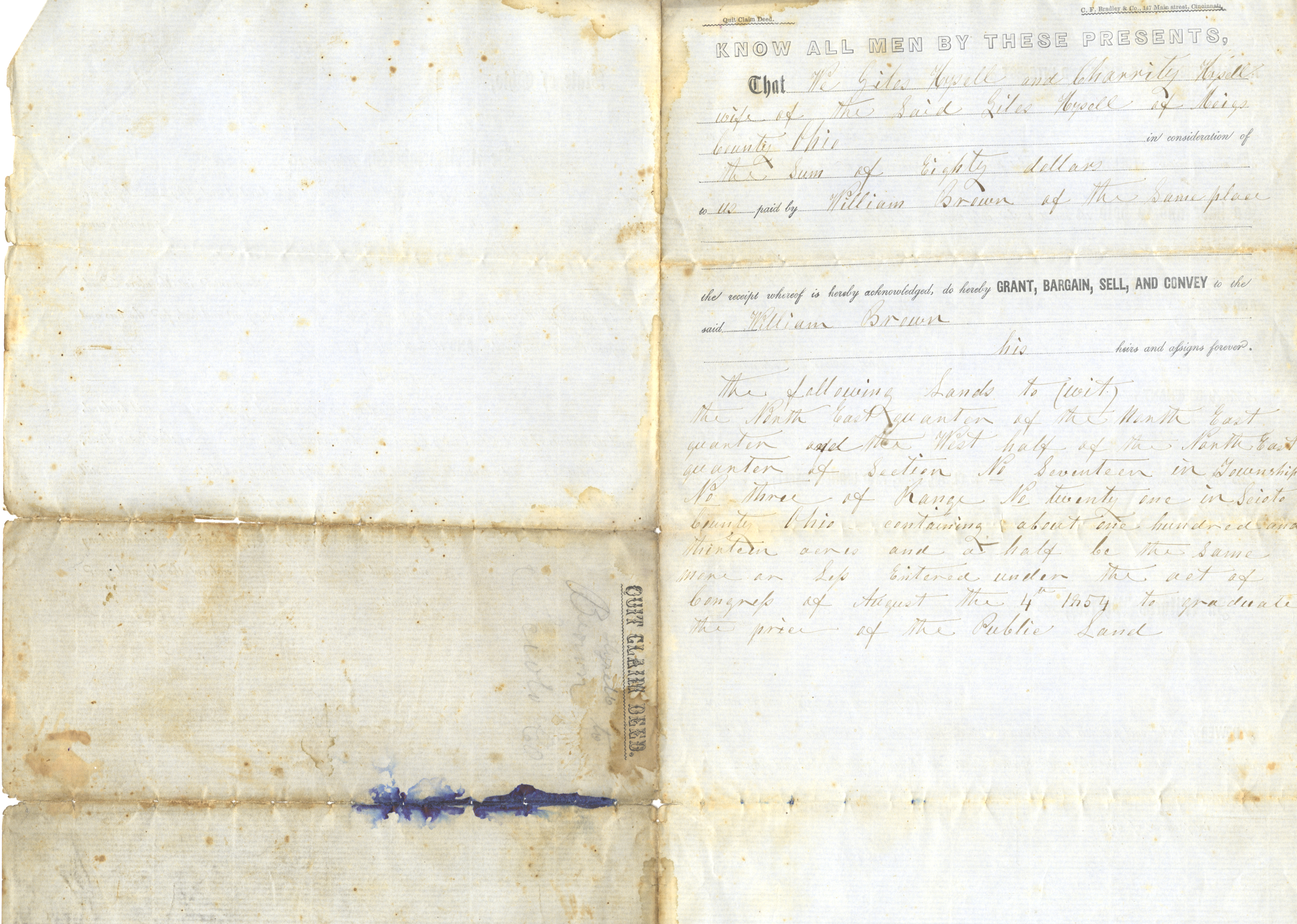 C.F. Bradley & Co., Cincinnati, Ohio, “Quit Claim Deed, Scioto County, Hysell to Brown,” Scioto County Public Library Local History Digital Collection, accessed December 16, 2025, https://sciotolibrary.org/history/items/show/29706.