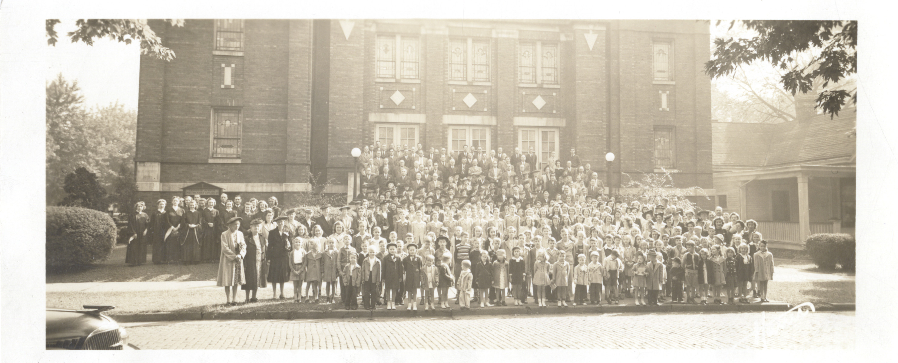- Black and white photo image of parisheners at Franklin Avenue Methodist Church in front of building. 1530 Franklin S.E. corner of Logan.