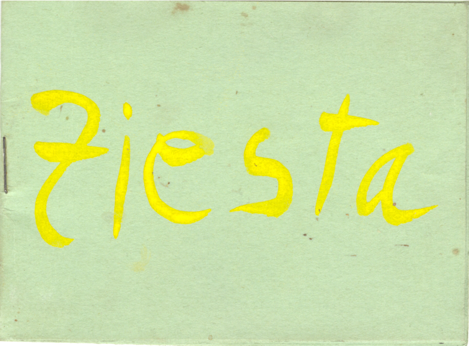 - Green, handmade, construction paper booklet with black print. Lists date, place, program and attendees. Front- "Fiesta" handwritten in yellow print.