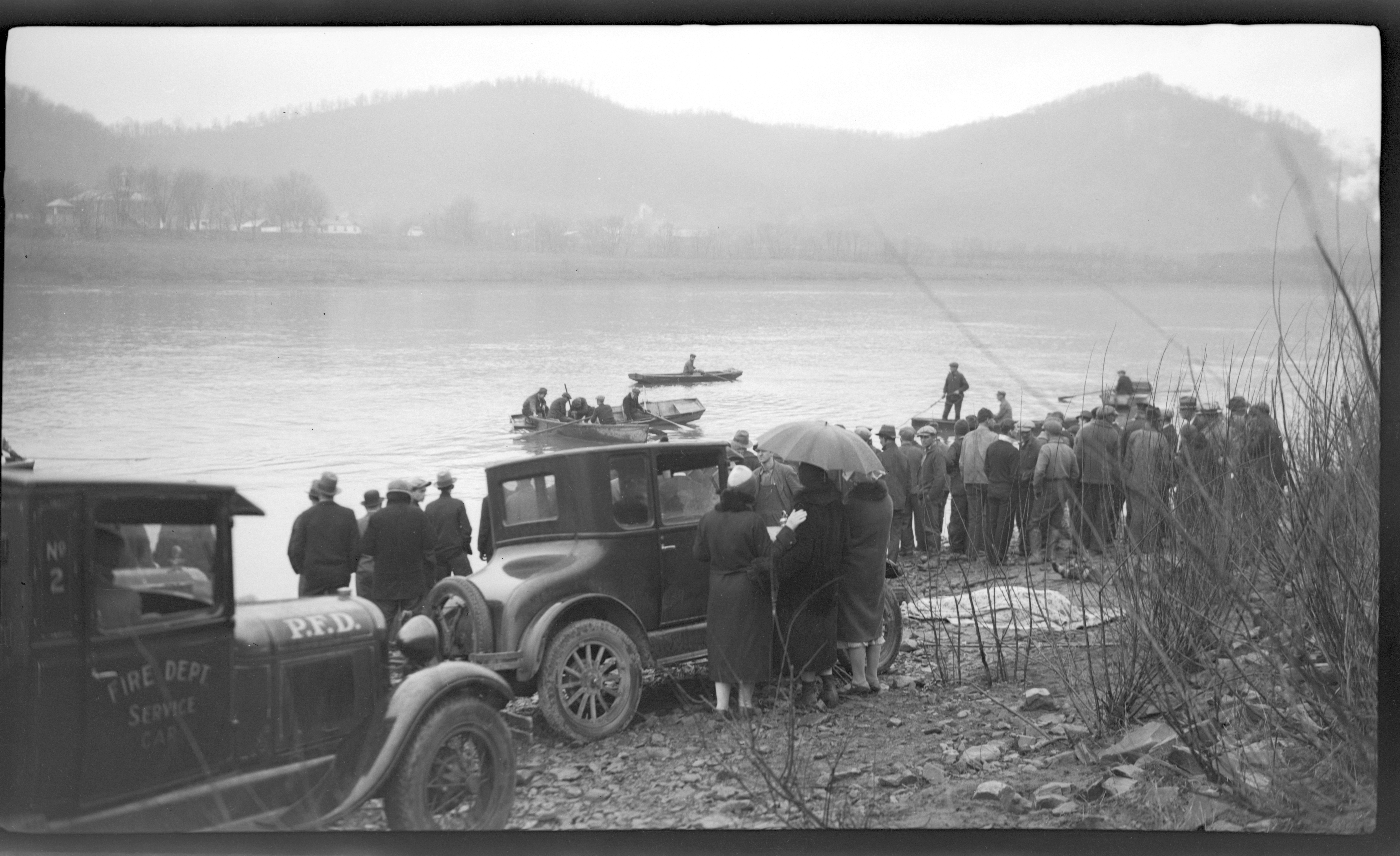 - Black and white photo negative of a crowd gathered around the river bank at the Sandy Springs Campground in Stout due to a drowning in the river. Fire Department vehicle can be seen to the left.