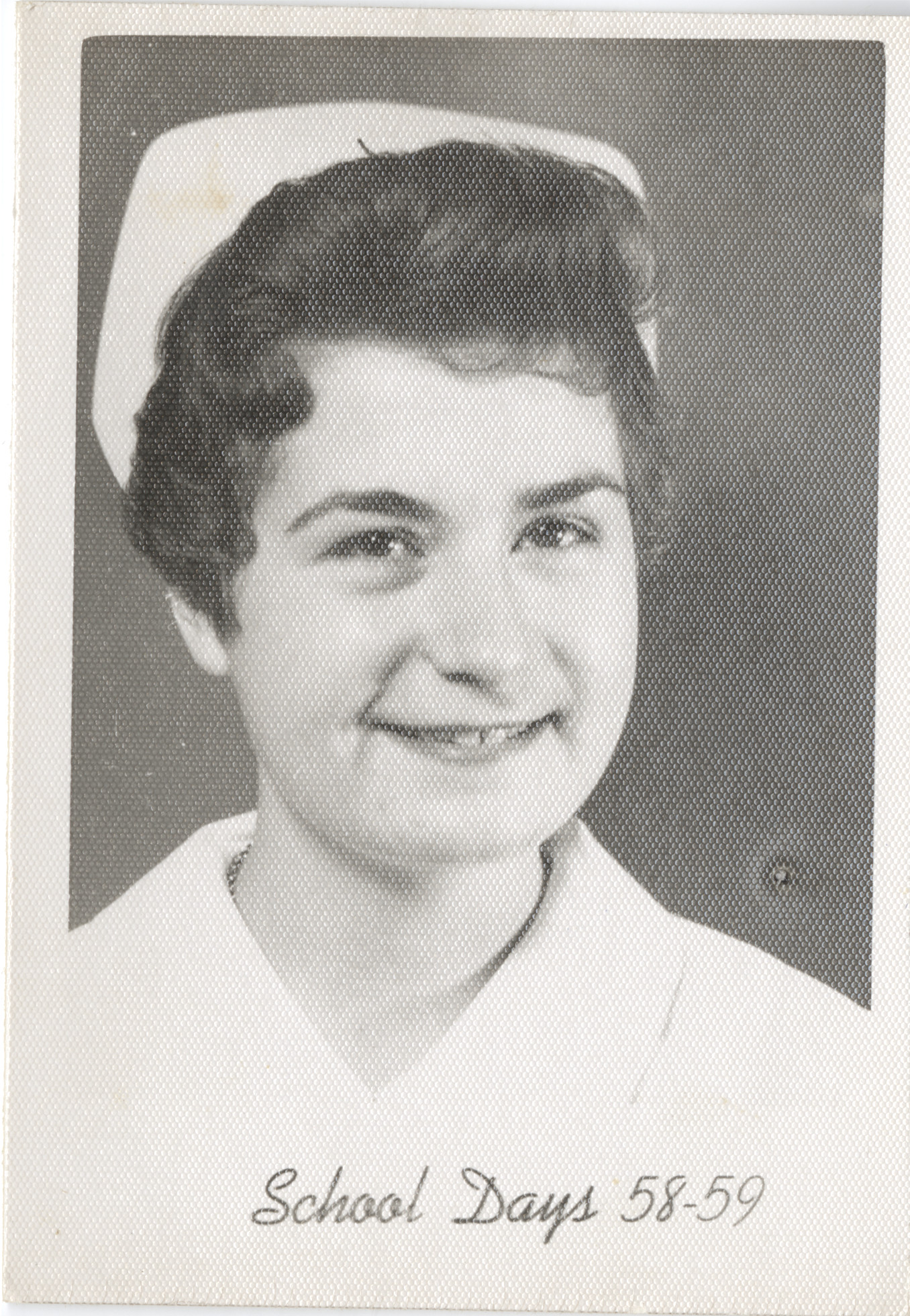 - Black and white portrait photo of Carol Burns, Mercy Hospital School of Nursing class of 1959. On back, "Ginny-to my walking buddy- we'll have to go shopping again. Will remember "peace" & our 13 wks here. Your sassy friend, Carol "Burnzie".