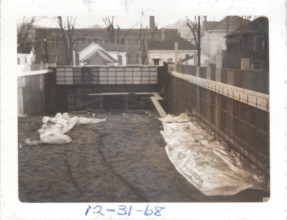 - Black and white photo image of the construction. Looking south with Grant School in background. Date written on front in blue ink.