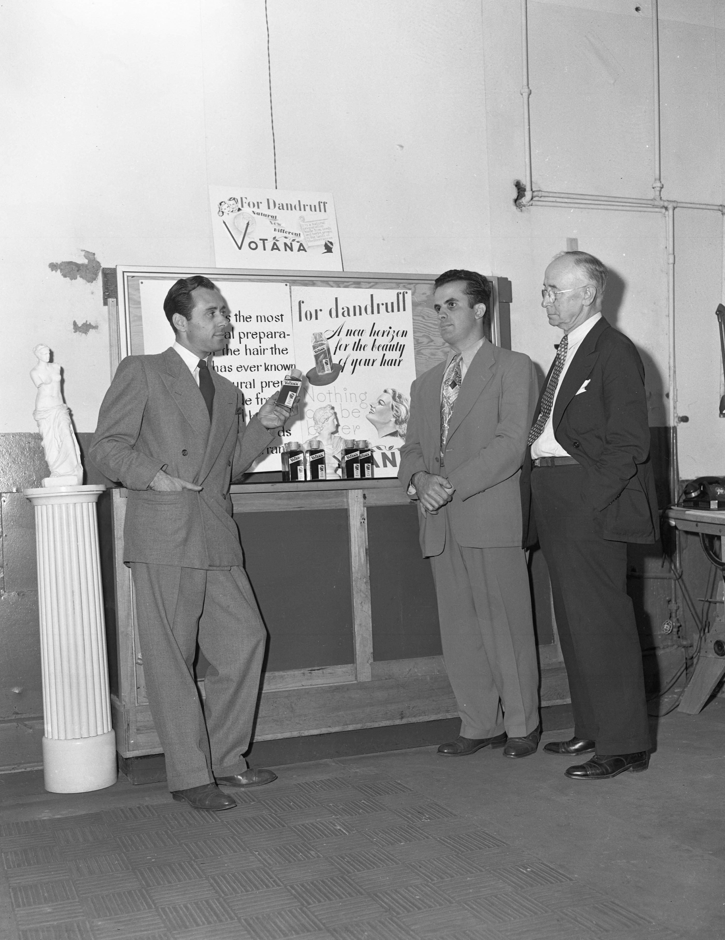 - Black and white photo negative of the three men standing in front of an ad for Votana, a hair product specifically for dandruff. L-R: George Pappitsas, Jim Malavazos, and John Switalski.