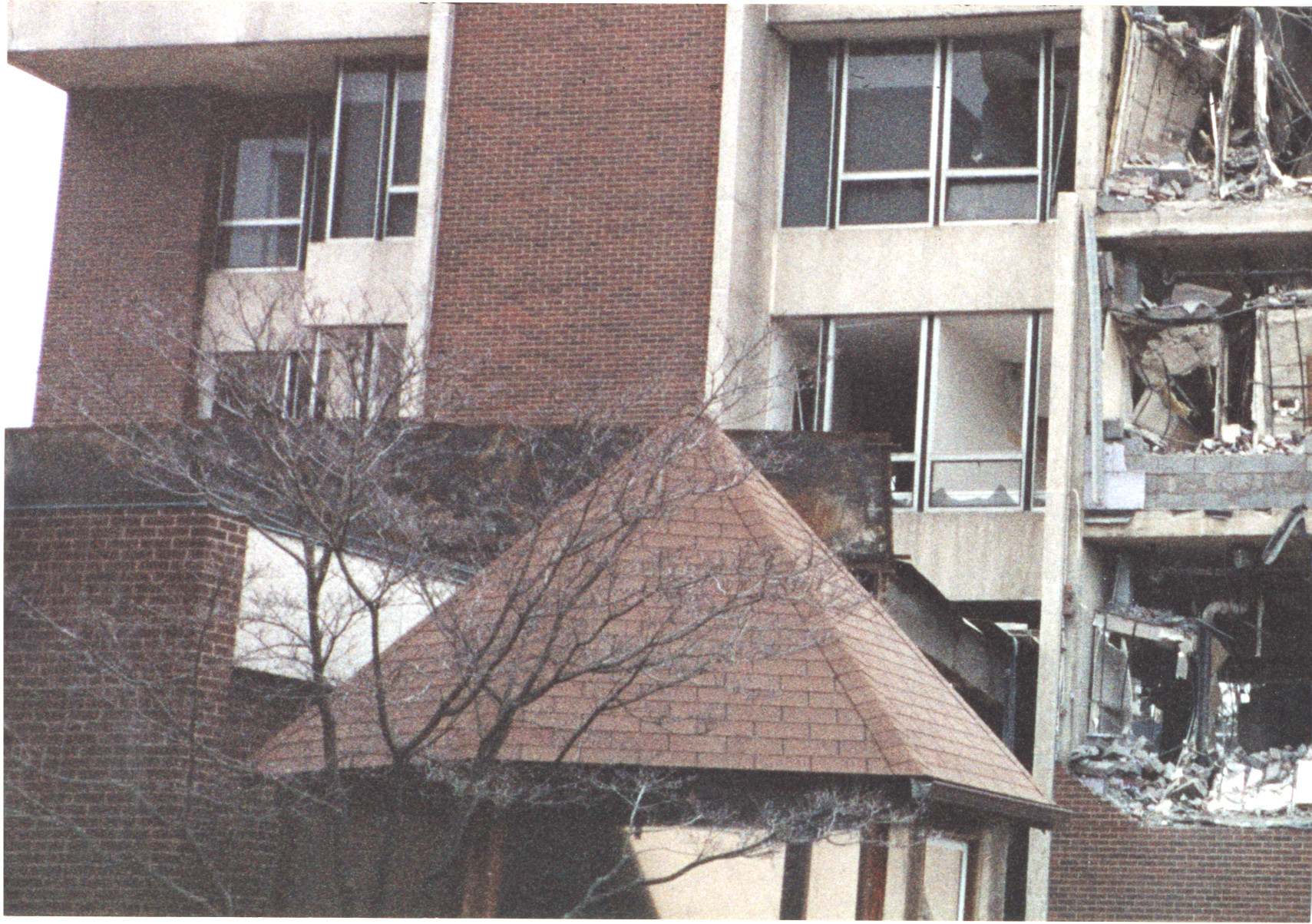 - Color photo of Mercy Hospital being razed.