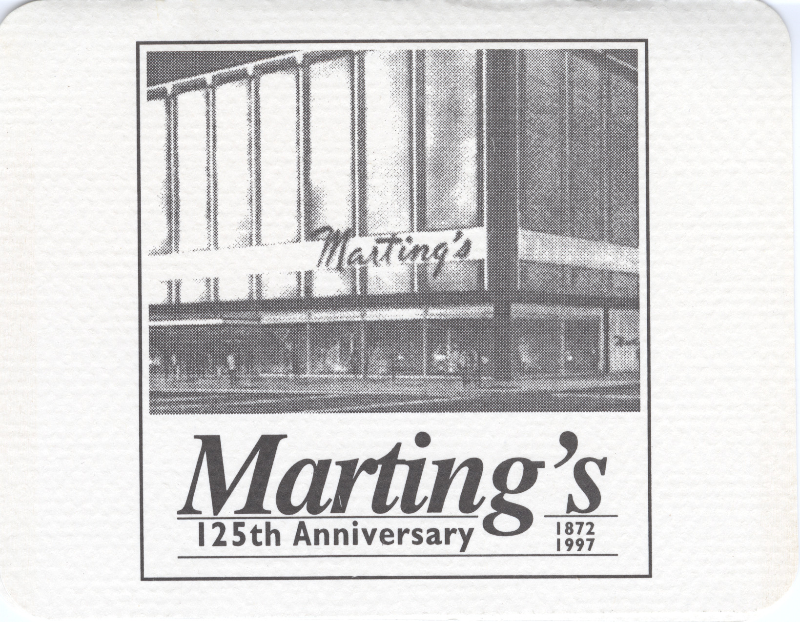 - White card with black and white image of the store front with black print, "Marting's, 125th Anniversary. 1872-1997. Blank inside.