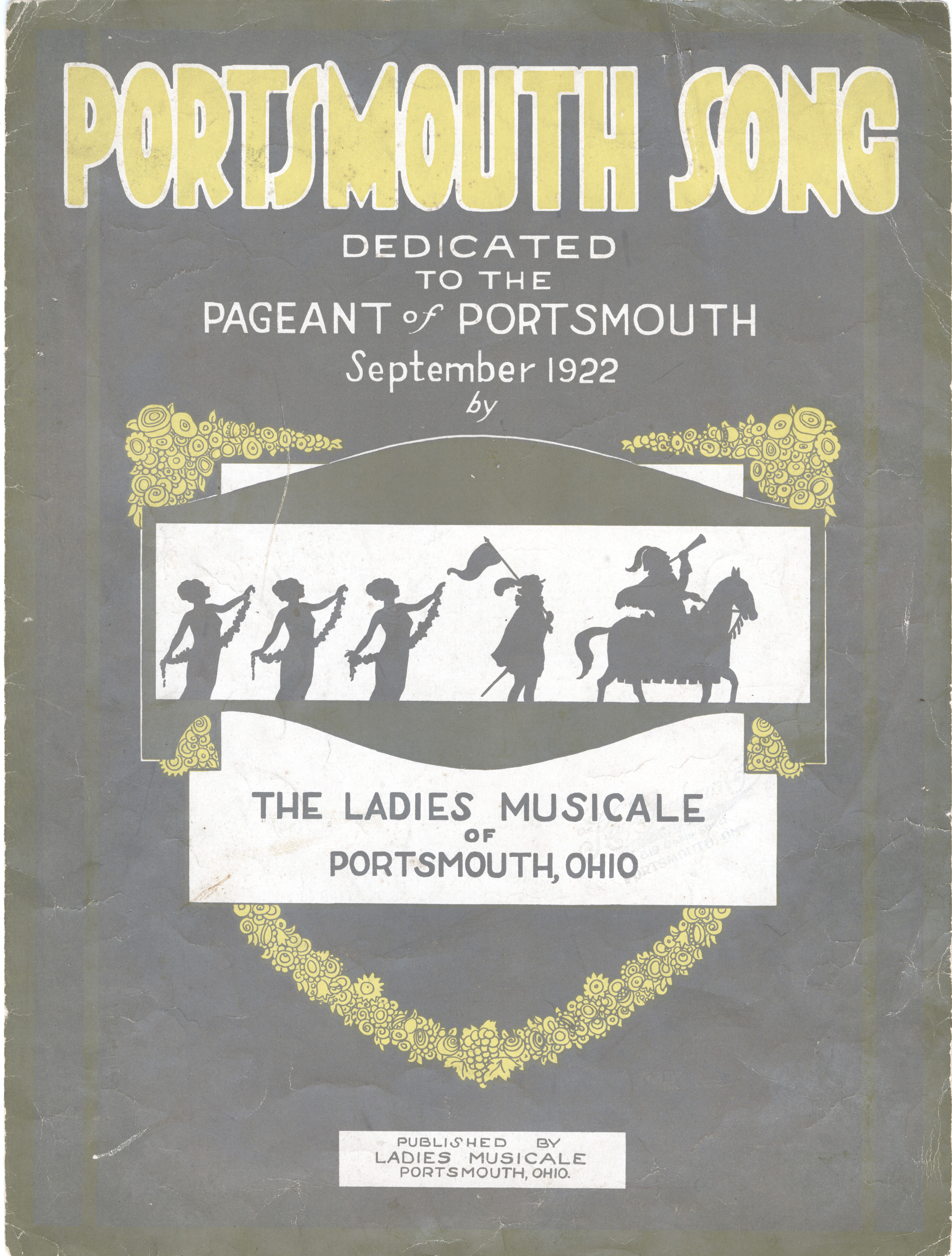 - Green, yellow and white paper pamphlet with "Portsmouth Song, Dedicated to the Pageant of Portsmouth, September of 1922." Yellow floral illustration with figures. Inside is the song with music.
