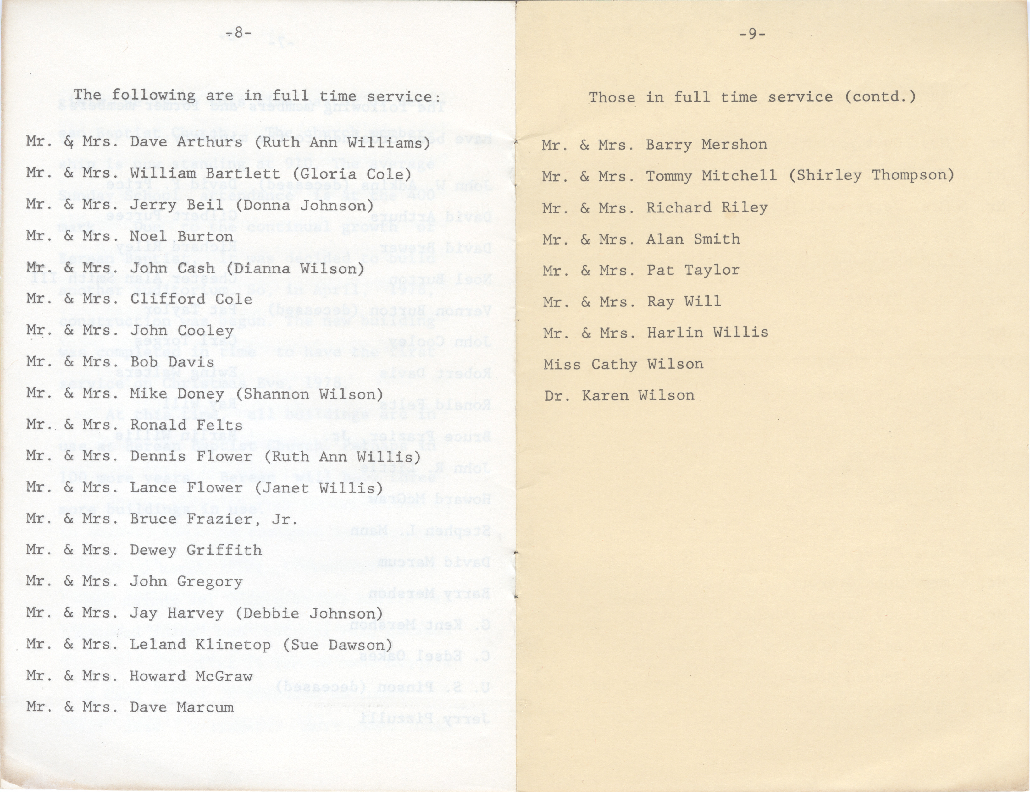 - Tan cardboard covered booklet with building images and black fonts. Inside is typewritten (9 pages) of the church history.