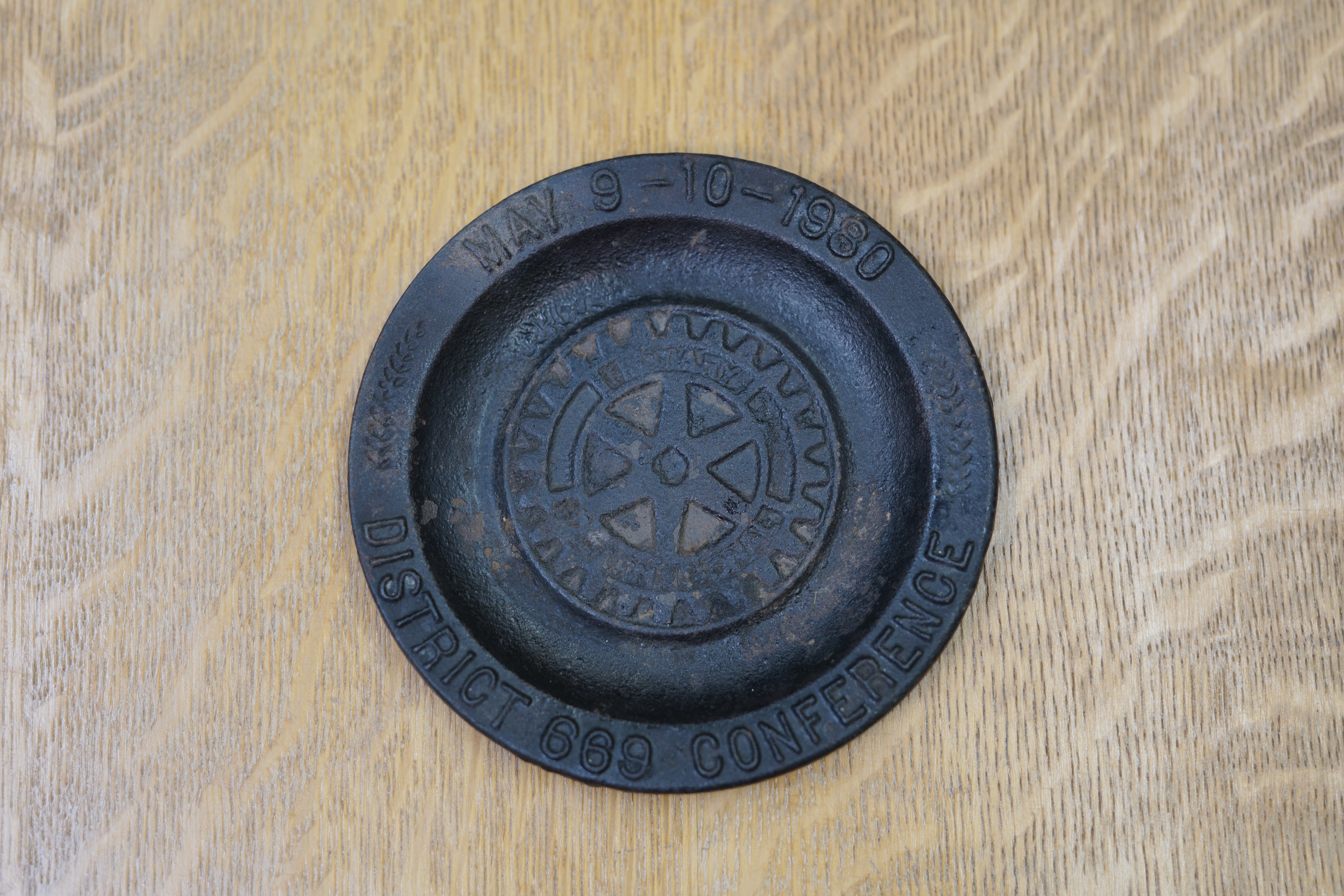 - A black cast iron trivet in the shape of a plate made by the OSCO Ind. Inc. for the District 669 Rotary Conference. Some rust and wear marks. The conference was held on may 9-10, 1980.