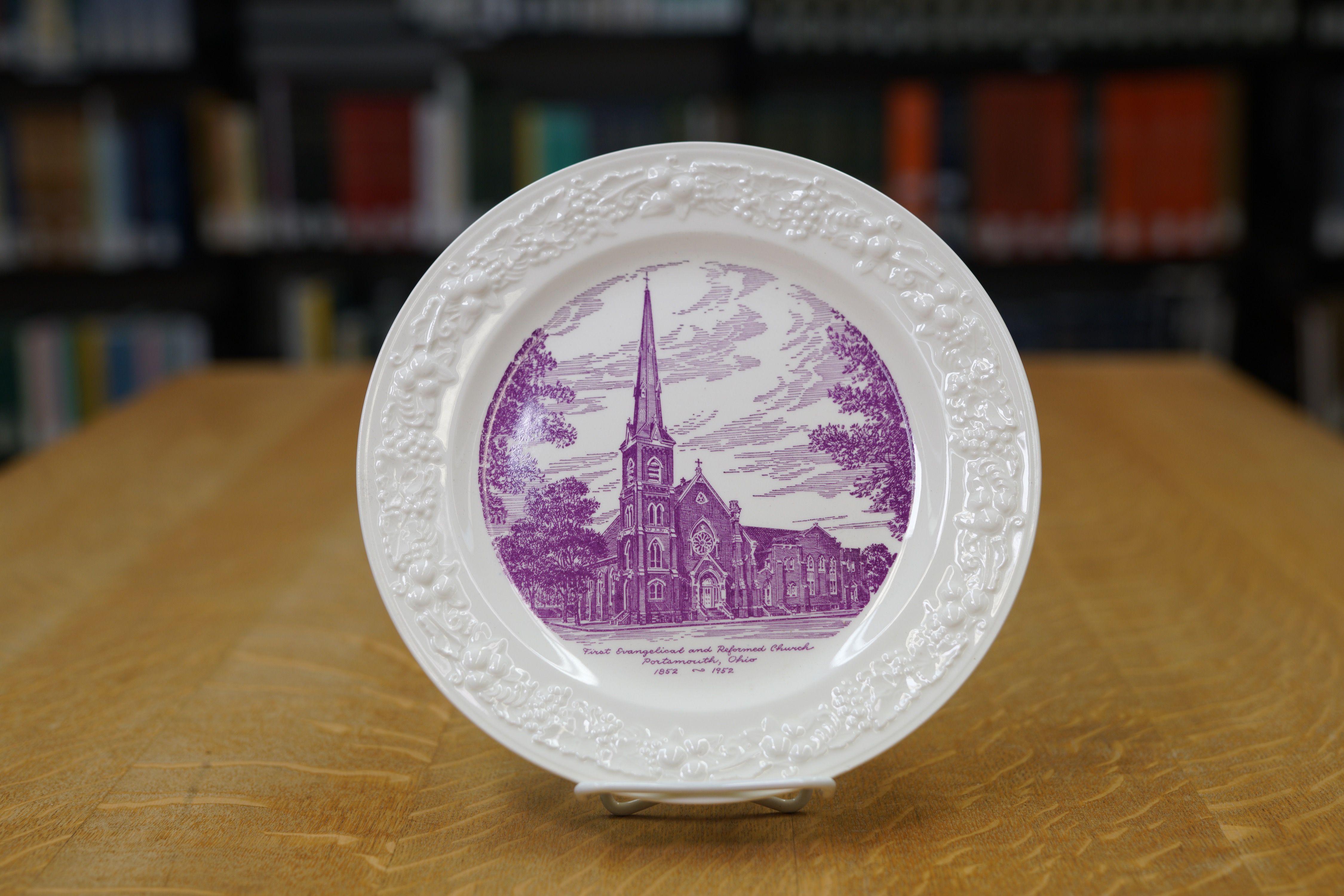 - White ceramic plate with purple writing and illustration of the First Evangelical and Reformed Church. For their 100th Anniversary.