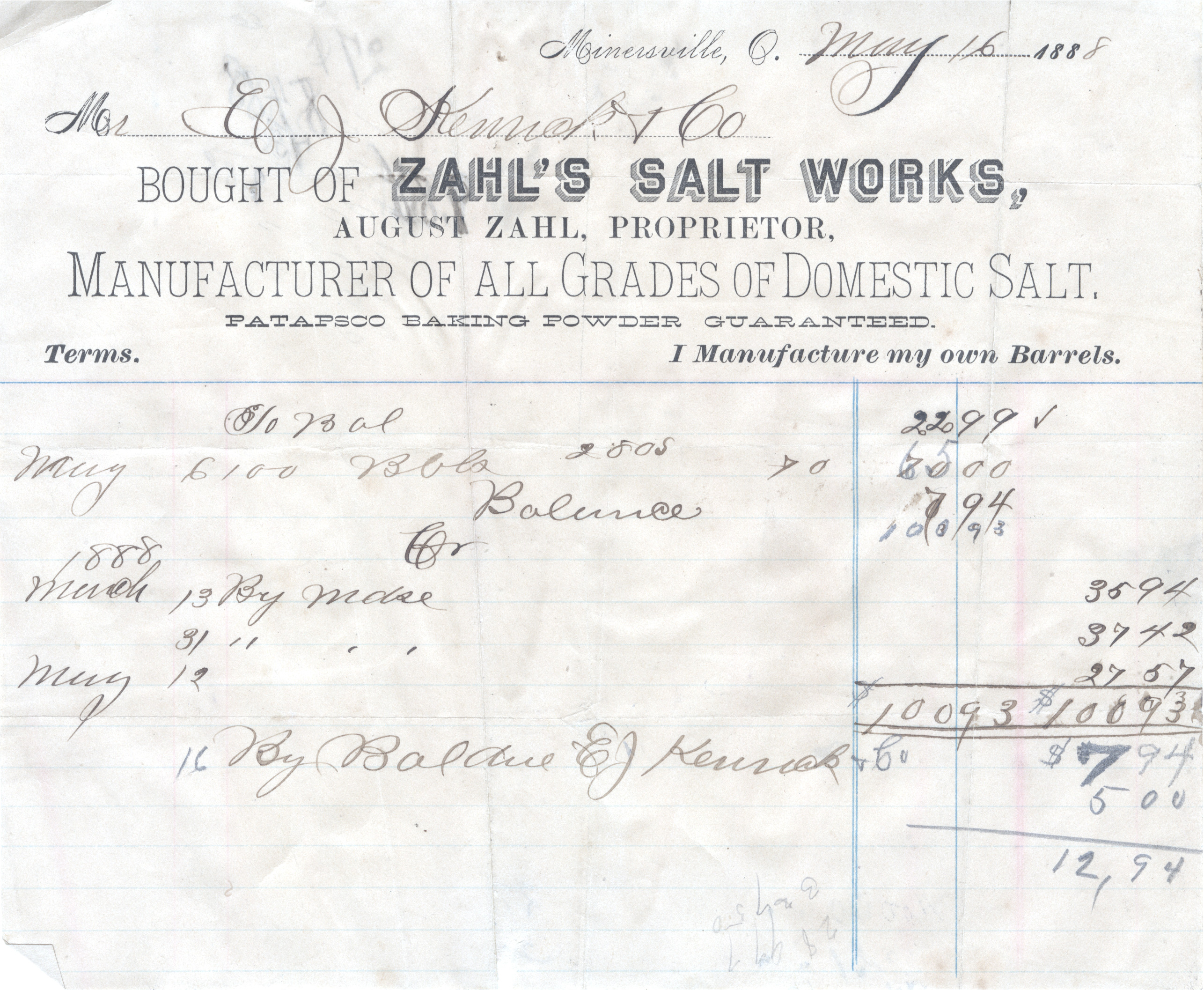 - Yellowed aged paper invoice with black fonts and black ink. Invoice to E.J. Kenrick from Zahl's Salt Works, Minersville, OH.