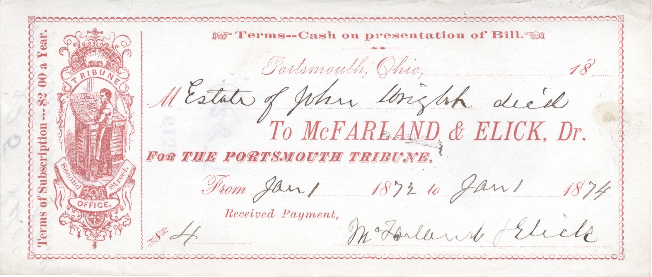 Unknown, “Payment Receipt from the Estate of John Wright dec'd,” Scioto County Public Library Local History Digital Collection, accessed December 15, 2025, https://sciotolibrary.org/history/items/show/32232.