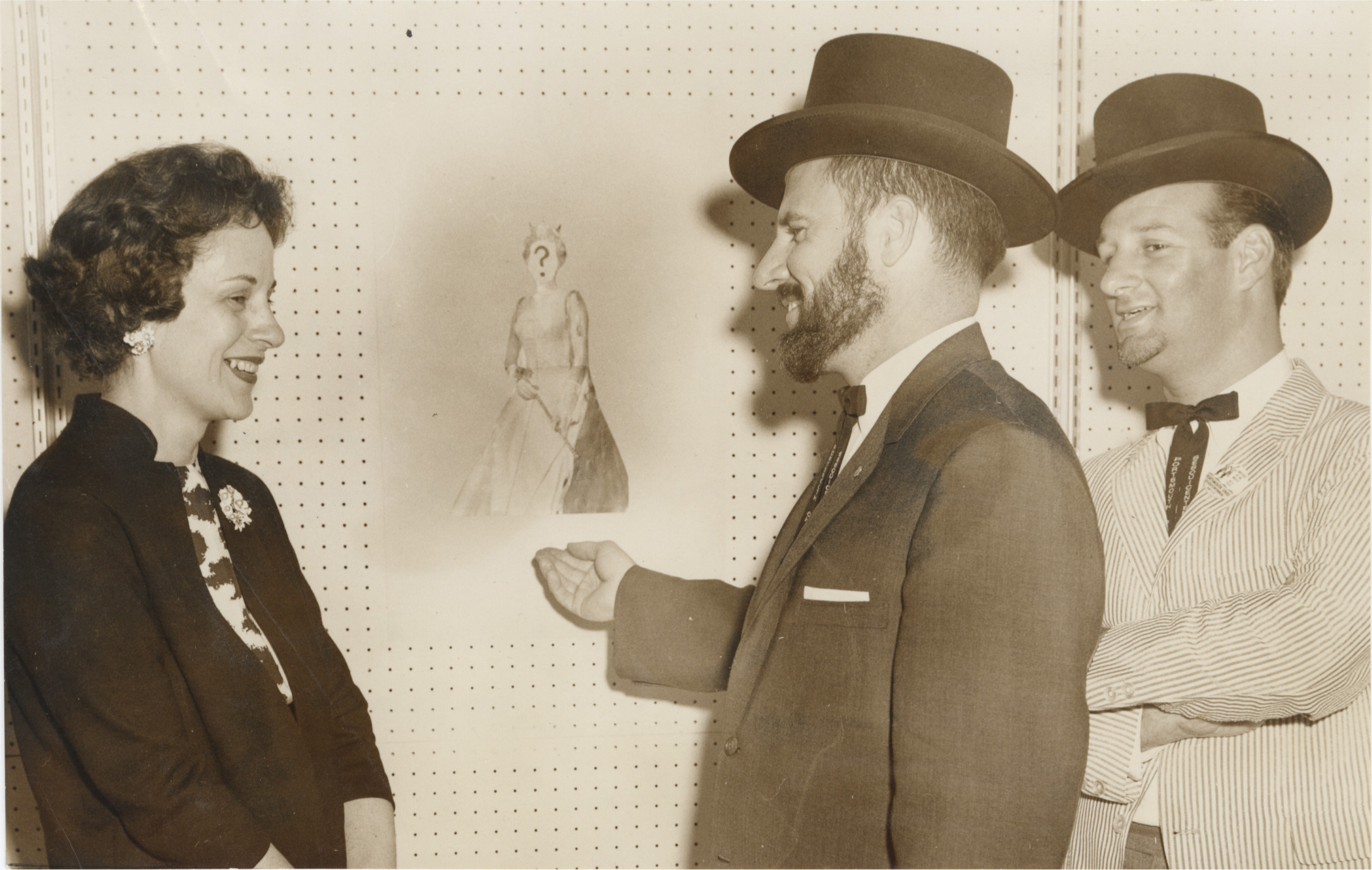 - Sepia-toned photo of Earl Felty (center), Ticket Division Chairman, Mrs. Charles Beaumont, Patron and Box Seat Ticket Chairman, and Joseph Newlin (right), Committee Business Manager for the John B. Rogers Company.