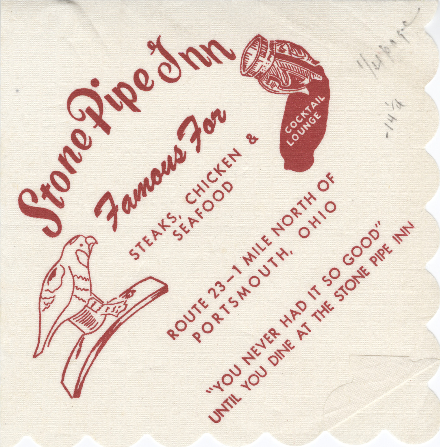 Unknown, “Stone Pipe Inn Napkin,” Scioto County Public Library Local History Digital Collection, accessed December 15, 2025, https://sciotolibrary.org/history/items/show/32265.