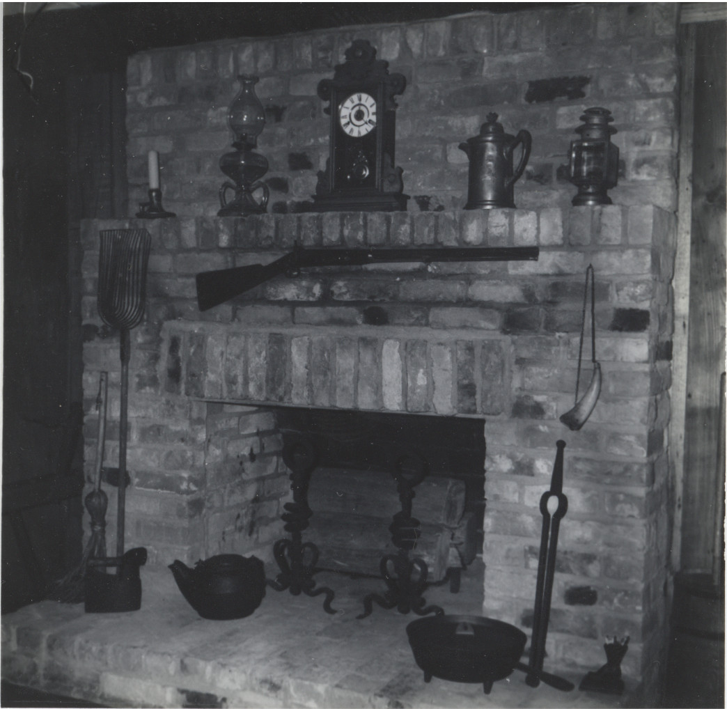 - Black and white photo image of the fireplace inside the homestead cabin. Shows many items used during the time period.