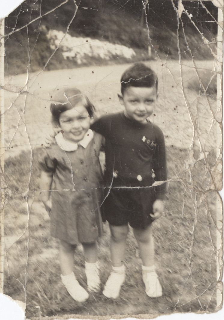 - Sepia-toned photo of Betty at 3 years and Skip at 4 years. Some damage and wear to photo: torn, folded wrinkles, and taped.