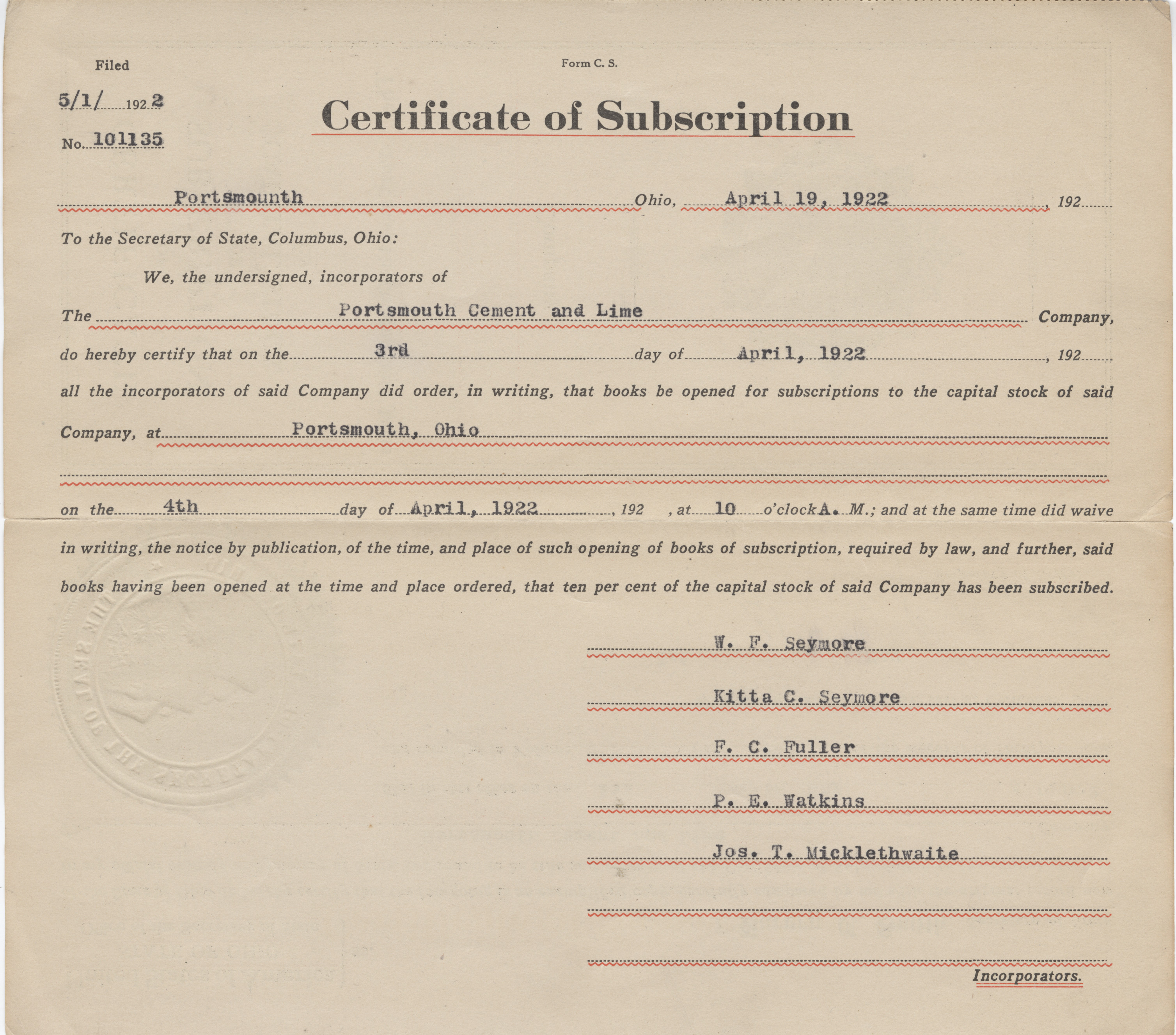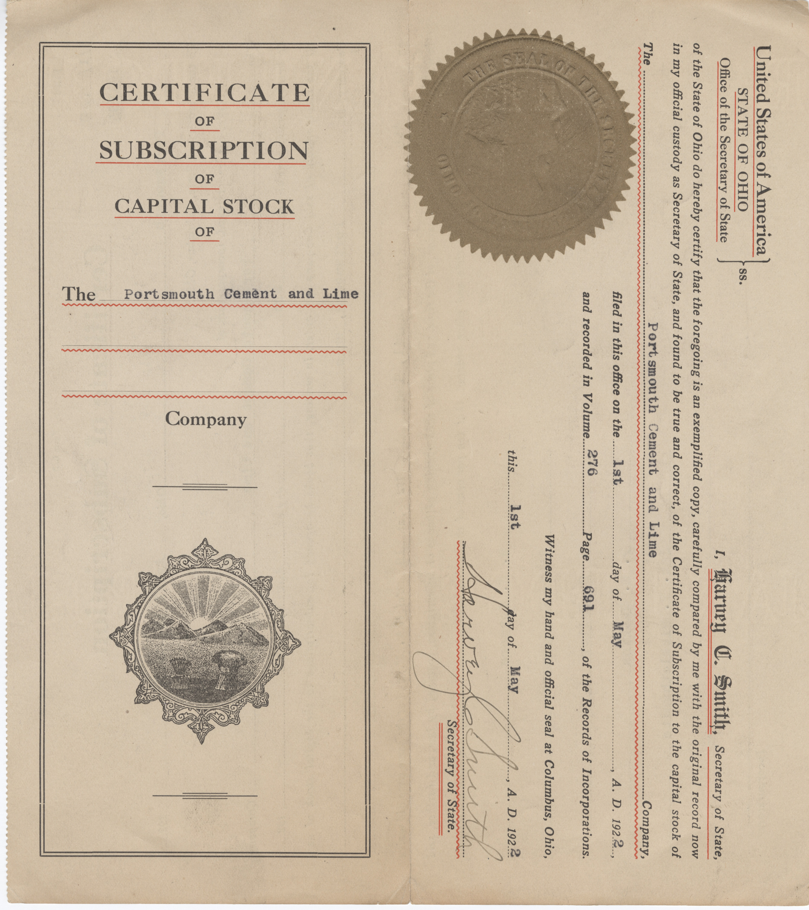 - Yellowed, aged, folded paper stock certificate of subscription for Portsmouth Cement & Lime Company. Black fonts and typewritten information. Official seal on front, list of names for incorporations on back.