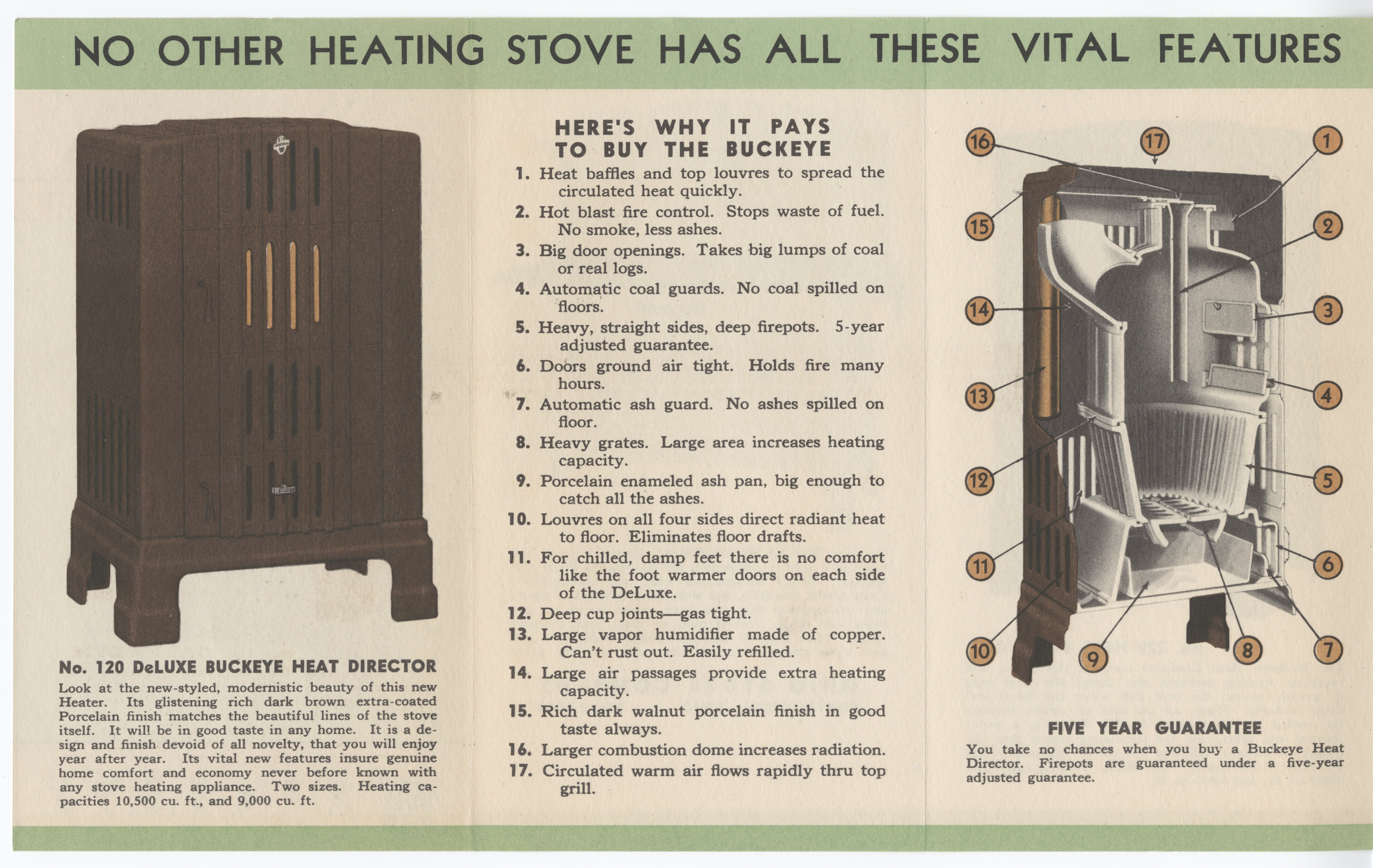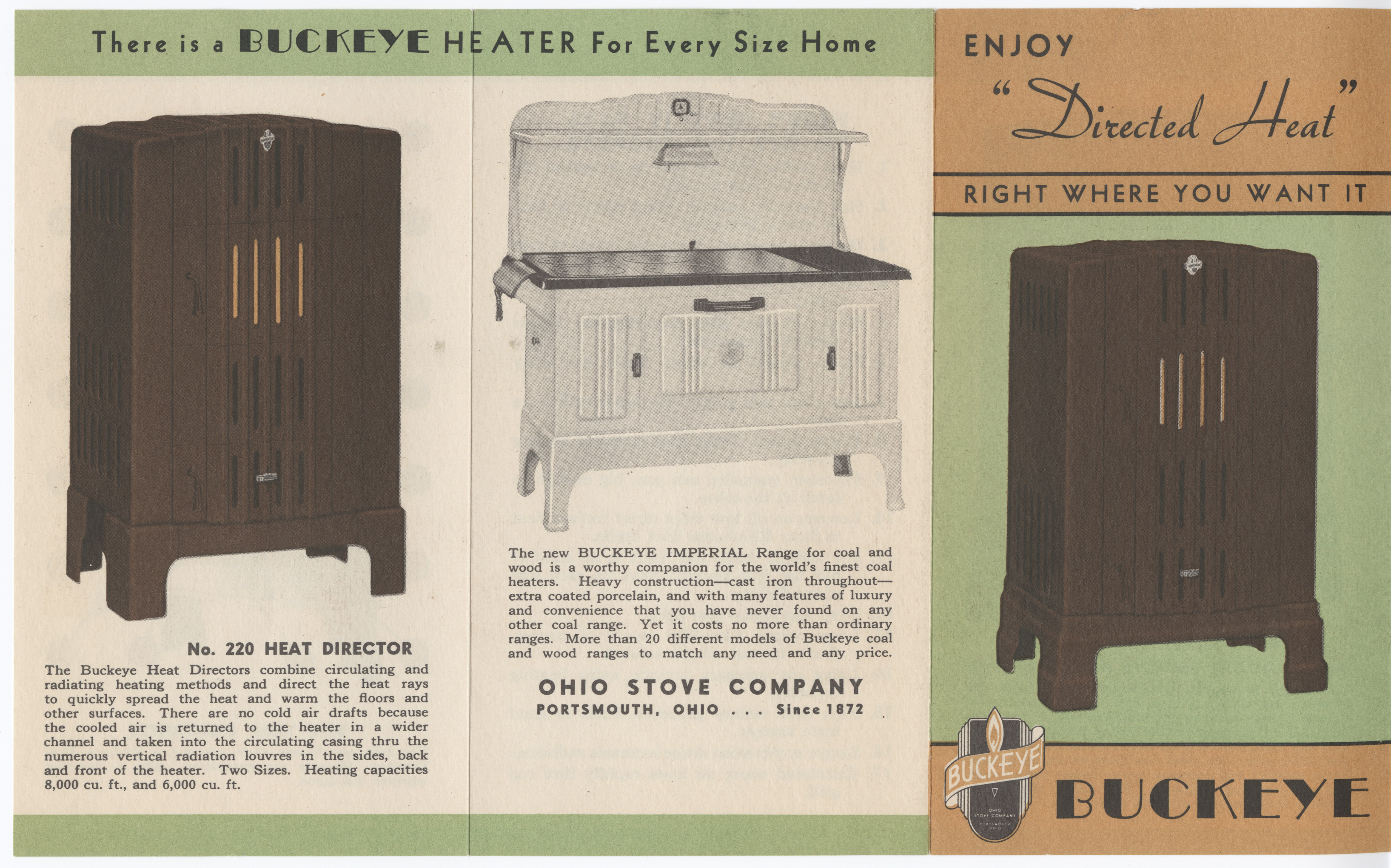 - Colored sales brochure. Orange, green, black and white paper with black fonts and illustrations of The Buckeye Stove made by Ohio Stove Company.