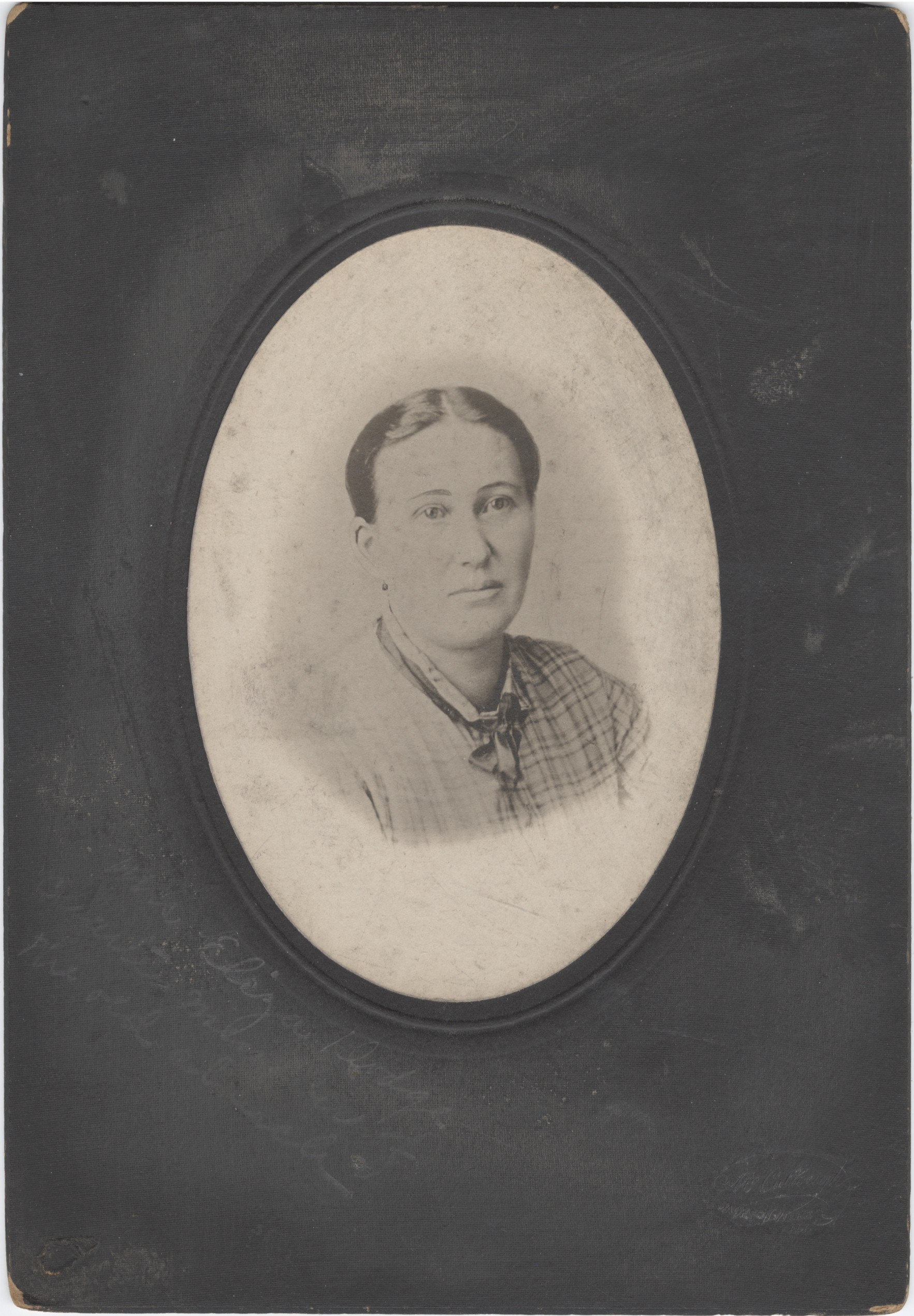 - Black and white photo image of Mrs. Eliza Dodge inside a cardboard frame. Writing on front: "Mrs. Eliza Dodge, Charter member of the Old Church."
