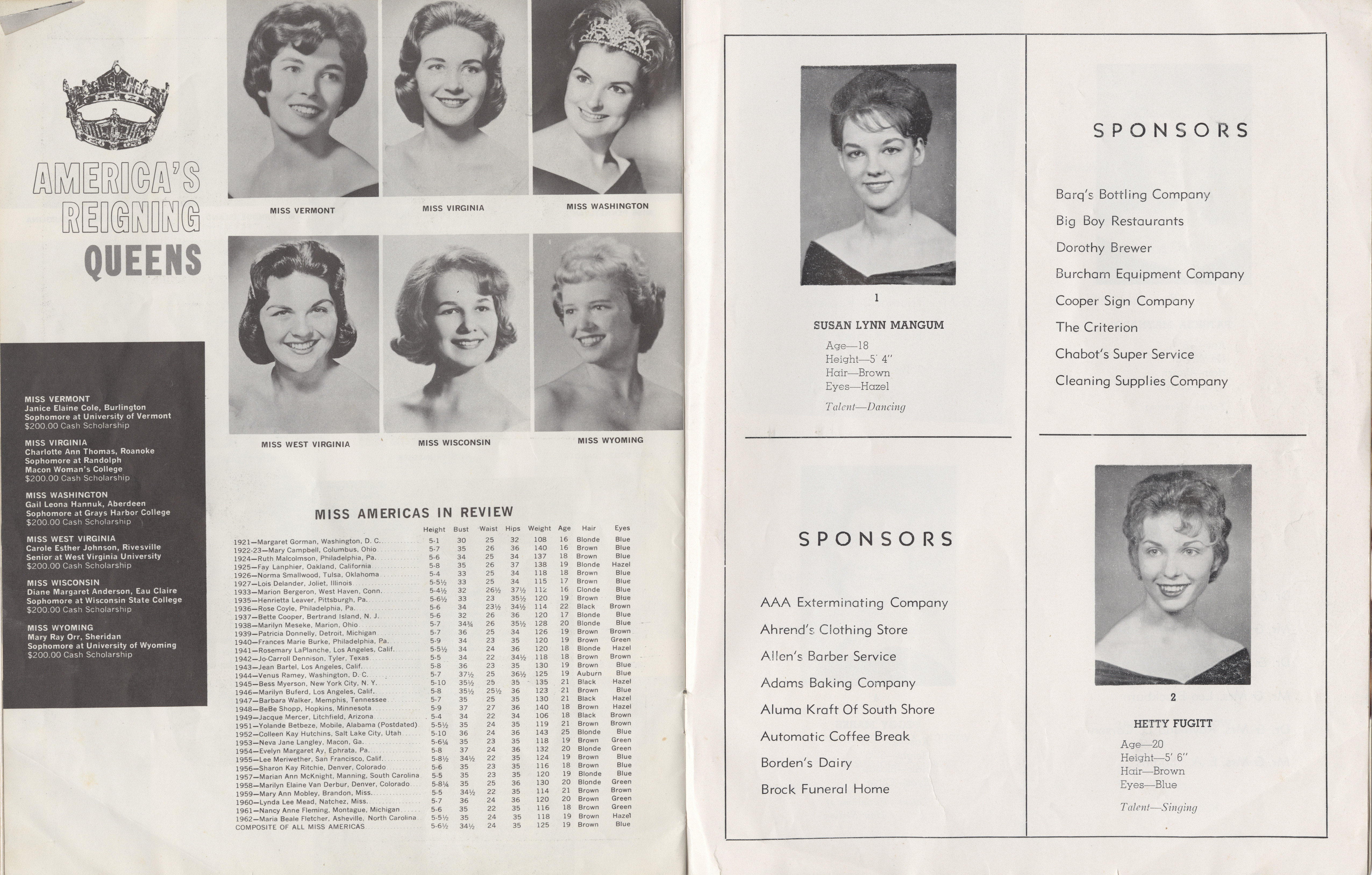 - Black and white, aged, 30-page program. Black, white, yellow, and pink cover and print. Color image of Miss American 1962 printed on cover.