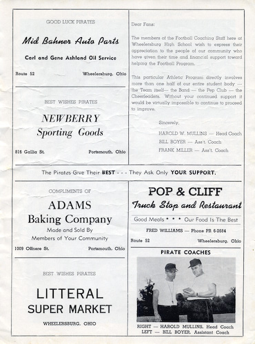 - Advertisement page in football program with photograph of Wheelersburg coaches,Harold Mullins & Bill Boyer.