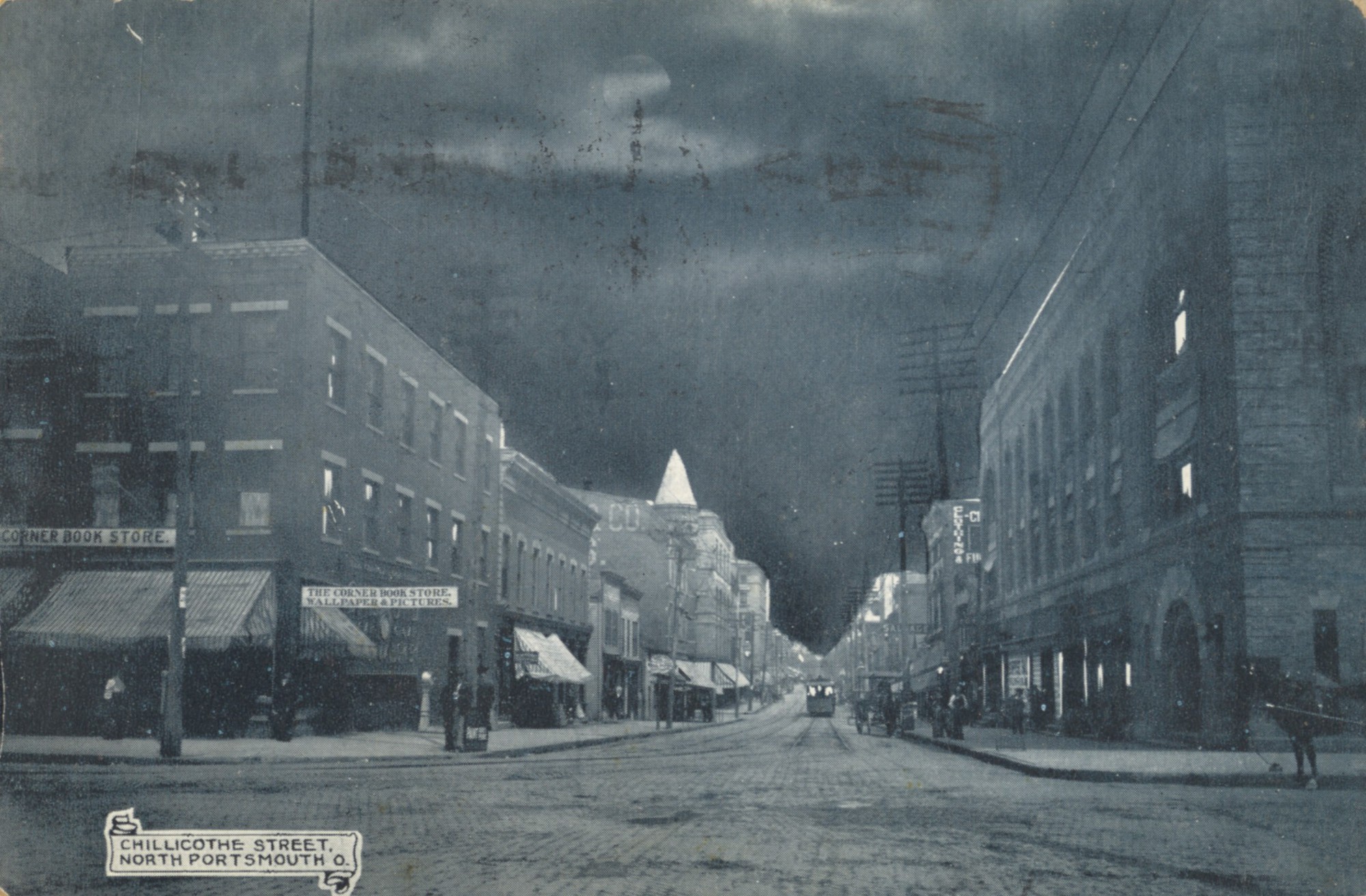 - Grayscale photomechanical print of a night scene on Chillicothe Street looking north; street car, Salvage Clothing and corner book store