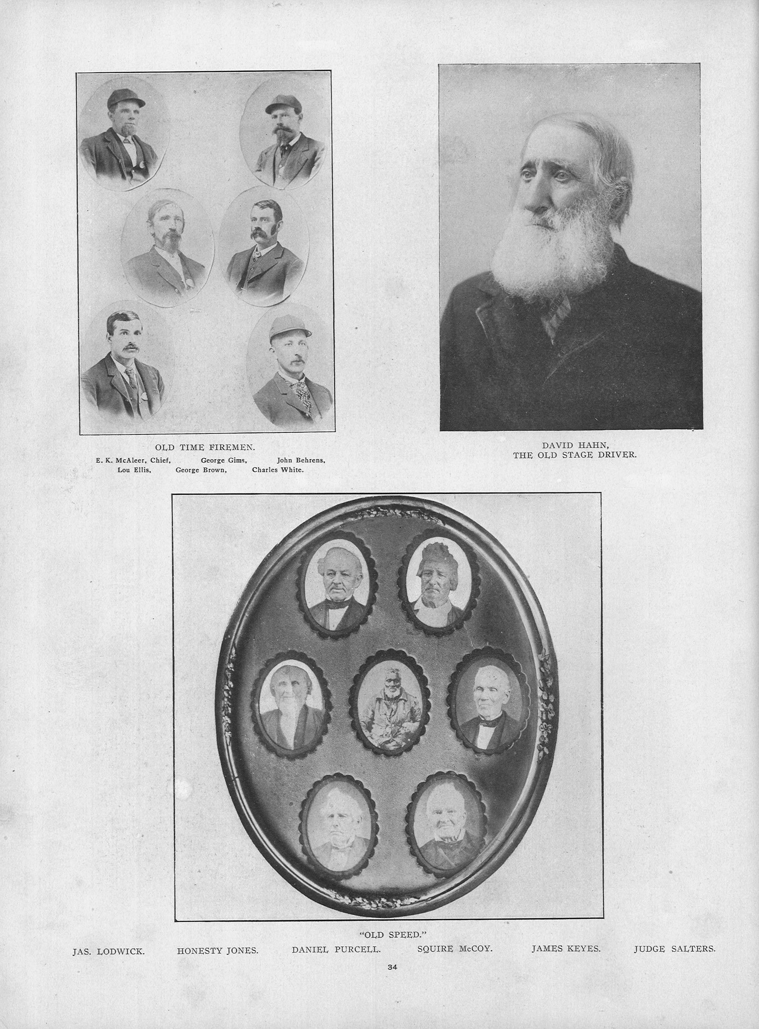 - Old Time Firemen; David Hahn, Old Stage Driver; James Lodwick, Honesty Jones, Daniel Purcell, "Old Speed", Squire McCoy, Judge Salters, James Keyes