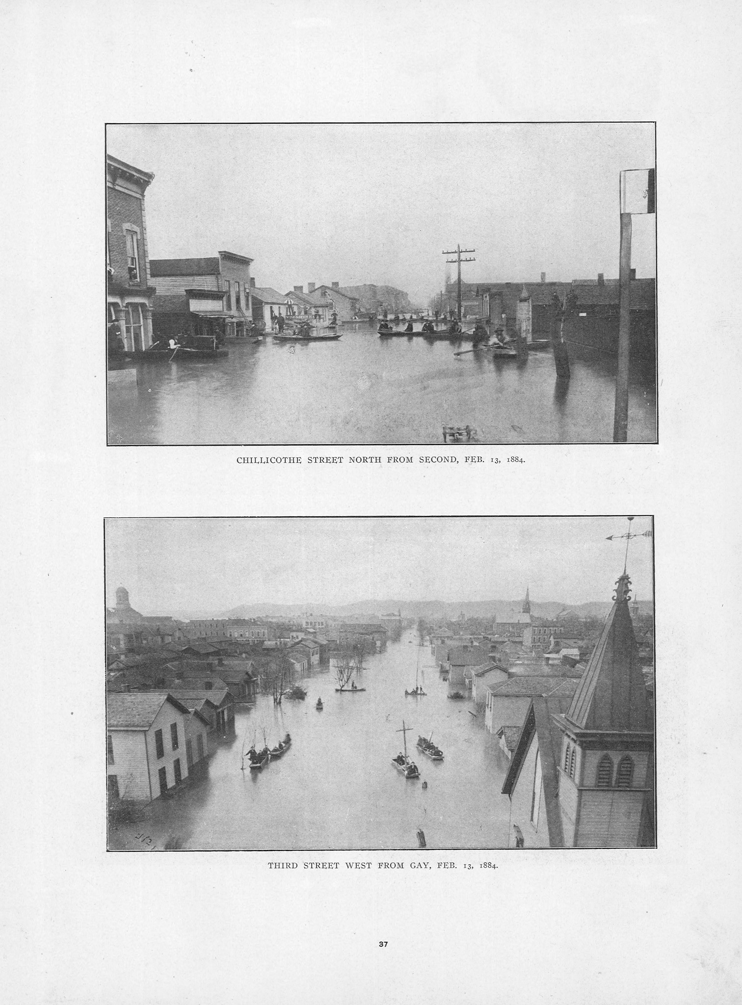 - page 37 - 2 black & white photo images showing the flood of 1884 that consumed the city. In Feb. 1884, the river crested at 66.3’