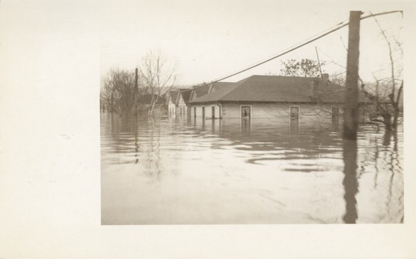 Black & white photo of flooded homes
