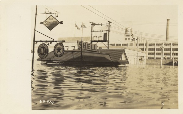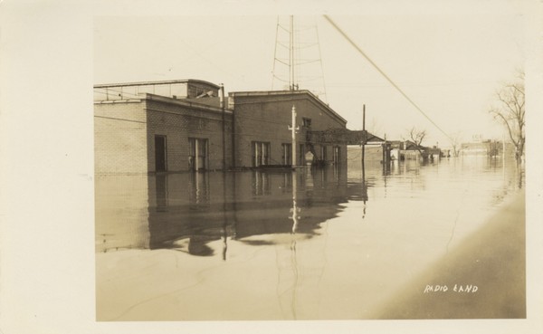 Sepia photo of Flood water around WPAY Radio building