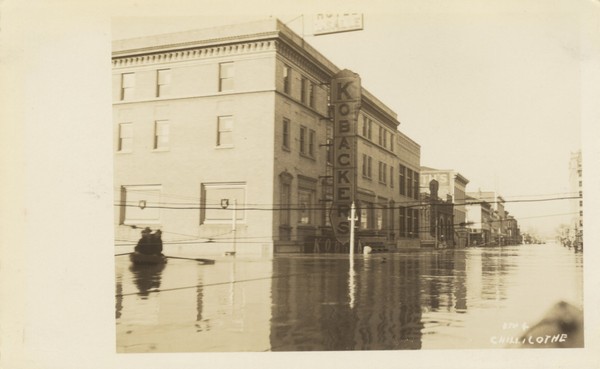 Sepia photo of Kobacker's Department store surrounded by flood waters