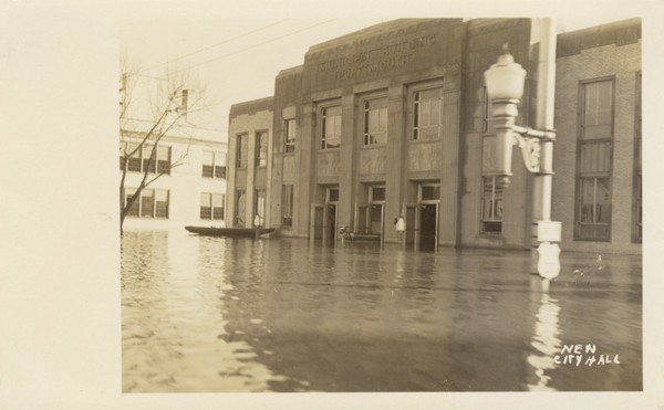 Sepia photo of the new City Hall surrounded by flood water